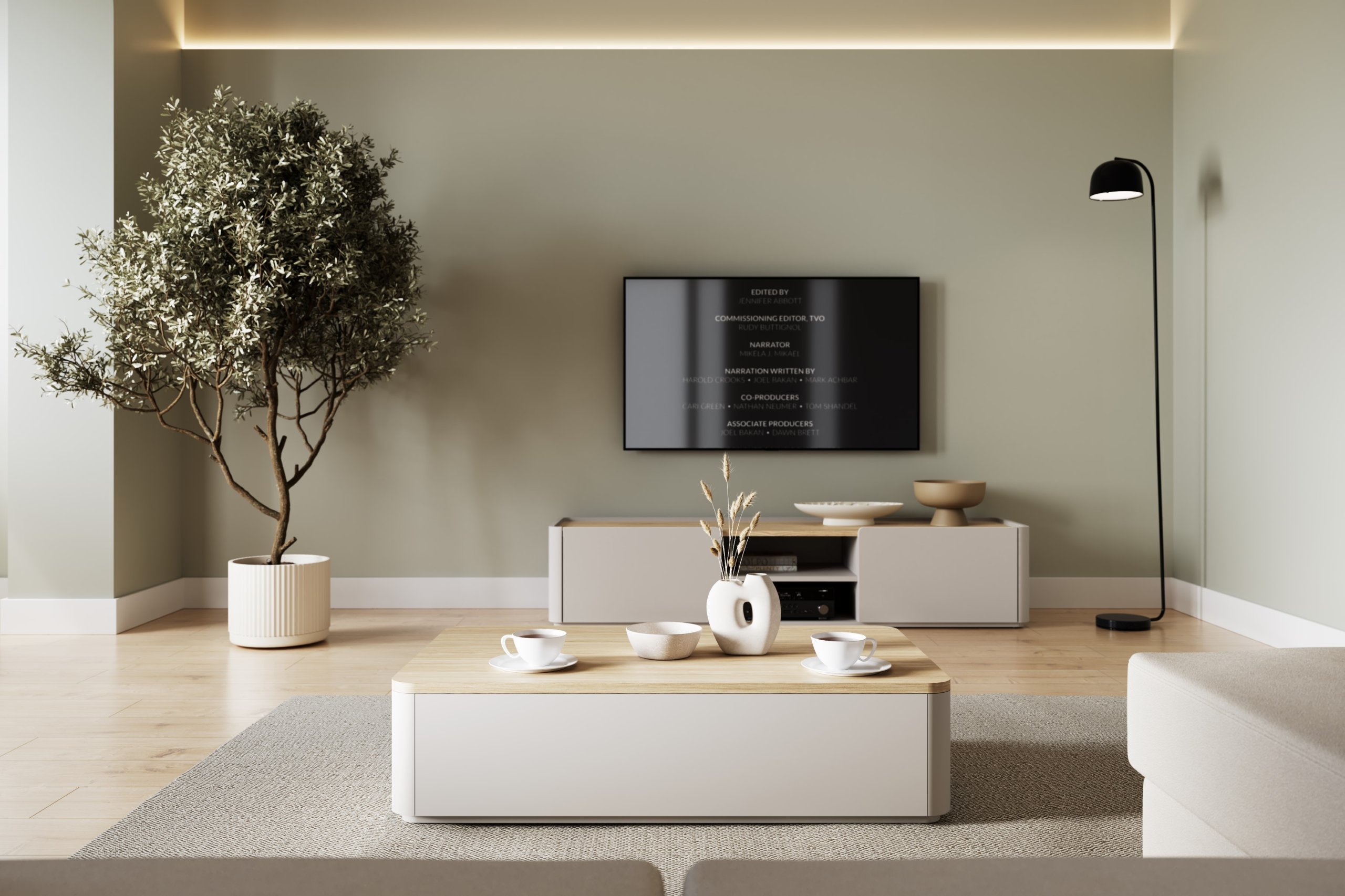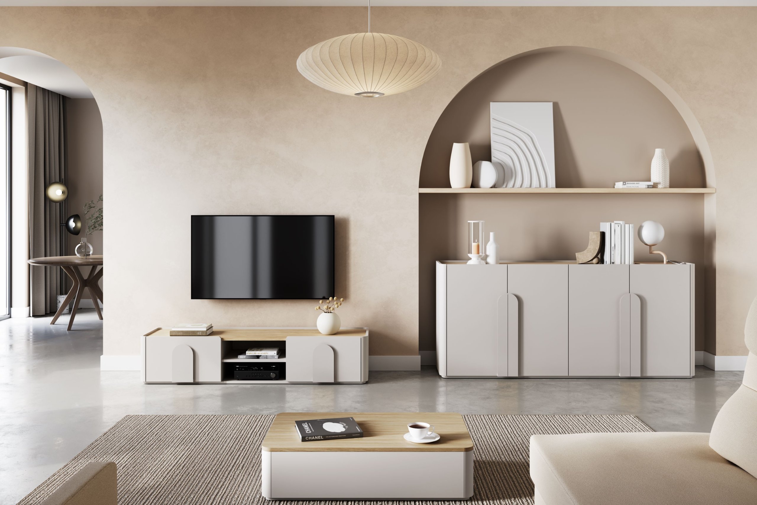 Njegova niska visina od 25,5 cm stvara moderan, prostran dojam u prostoru, a istodobno osigurava udobnu visinu za odlaganje svakodnevnih predmeta. Iako je dizajniran minimalistički, ističe se profinjenim detaljima poput mekog zatvaranja, odsutnosti vidljivih ručkica i harmoničnog prijelaza između obojenih površina.