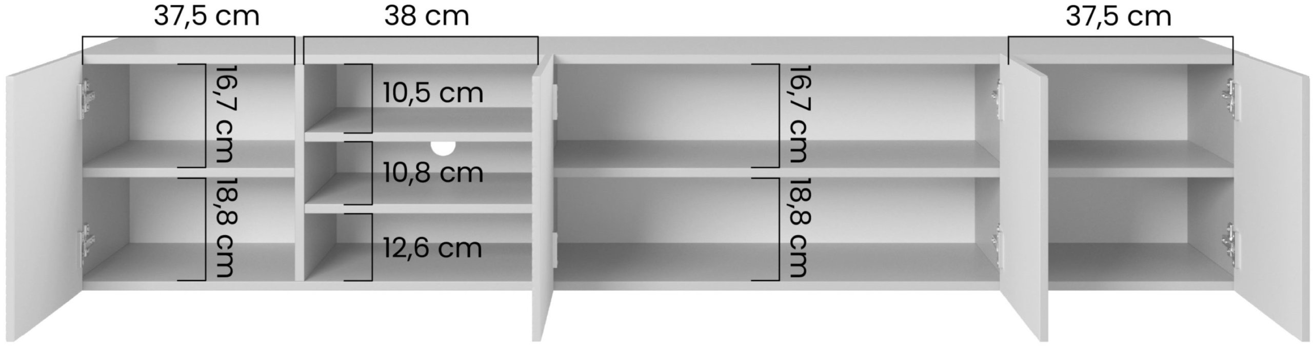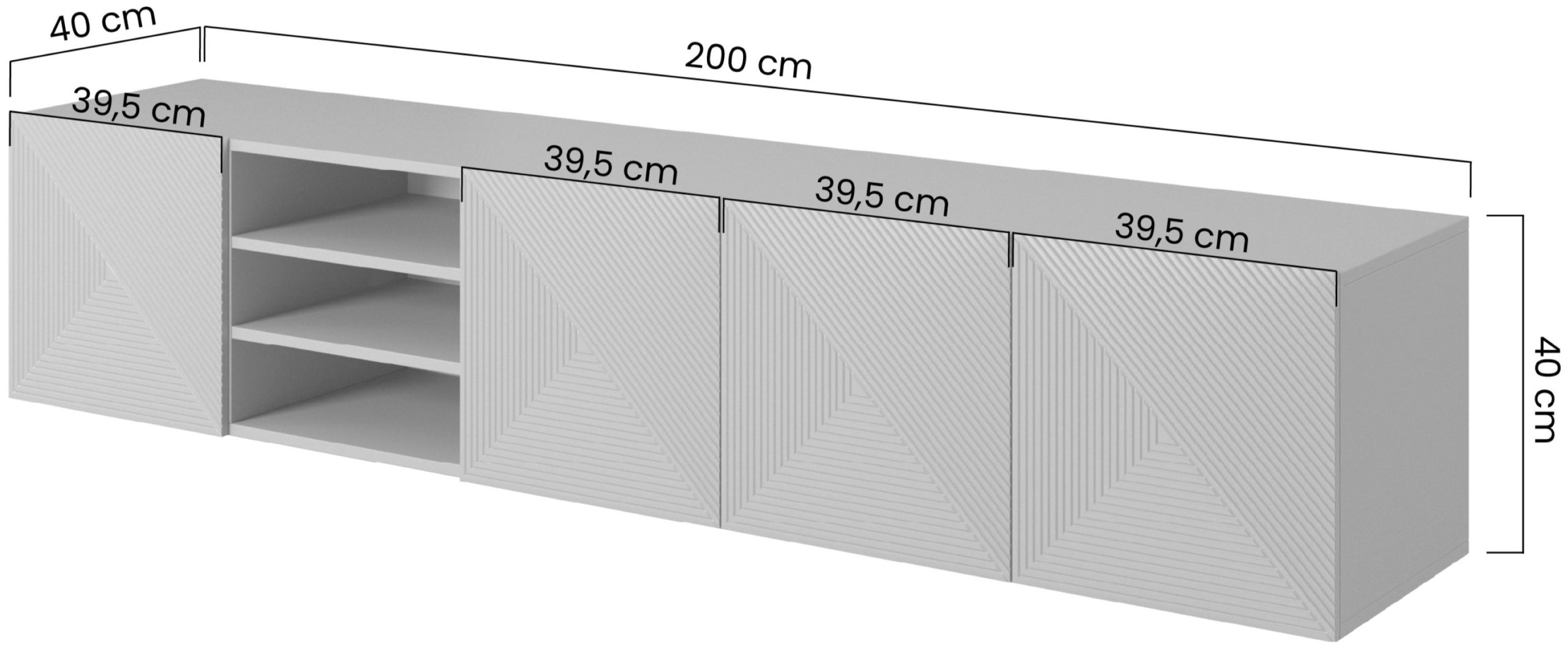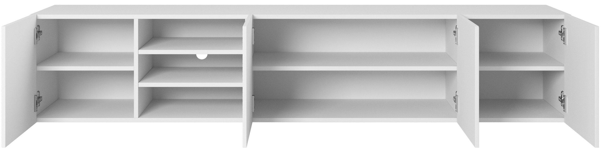 Minimalističke bijele fronte bez ručki stvaraju harmoničan izgled koji ne dominira nad ostatkom opreme prostora. Površina u mat izvedbi sprječava vidljivost otisaka prstiju i omogućuje lakše održavanje. Zbog svoje širine od 200 cm, komoda nudi više zatvorenih jedinica za pohranu, idealnih za skrivanje kabela, dodataka ili dokumenata, čime održava uredan izgled dnevne sobe. Unutarnji raspored prilagođen je suvremenim potrebama – dovoljno prostran za igraće konzole, prijemnike, knjige ili dekorativne predmete.