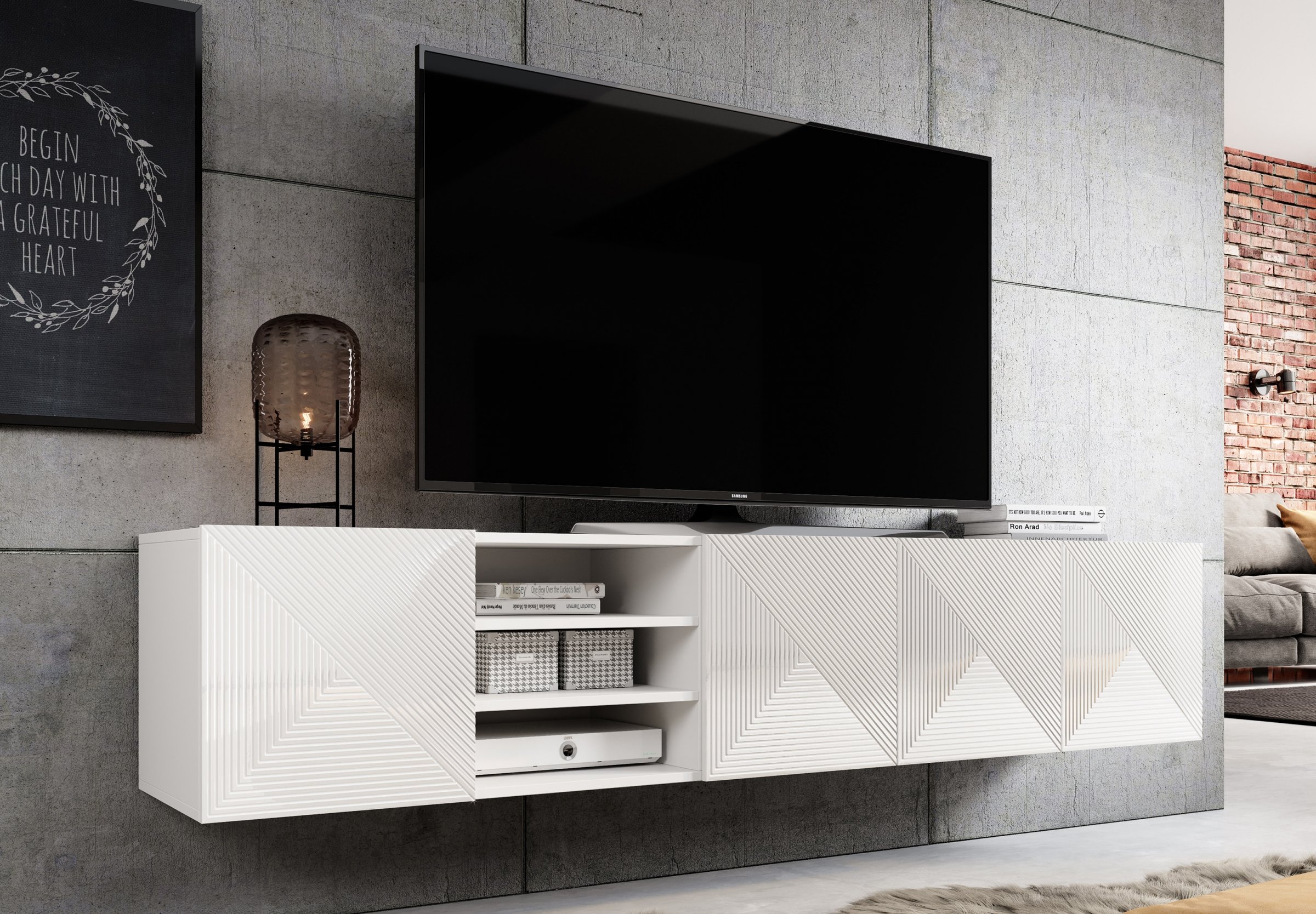Zidna TV komoda Asha 200 5D – Bogart zahvaljujući svojoj neutralnoj paleti boja odlično se uklapa s različitim materijalima i teksturama, poput drva, metala ili stakla. Može se kombinirati s visećim ormarićima ili policama iz iste serije za stvaranje cjelovite namještajne kompozicije. U otvorenim prostorima, gdje dnevni dio prelazi u blagovaonicu ili kuhinju, komoda djeluje kao povezujući element koji osigurava vizualnu cjelovitost prostora.