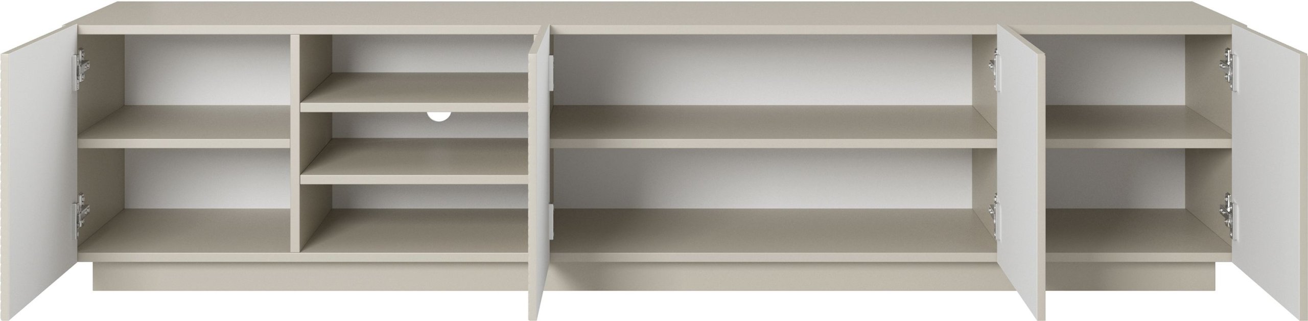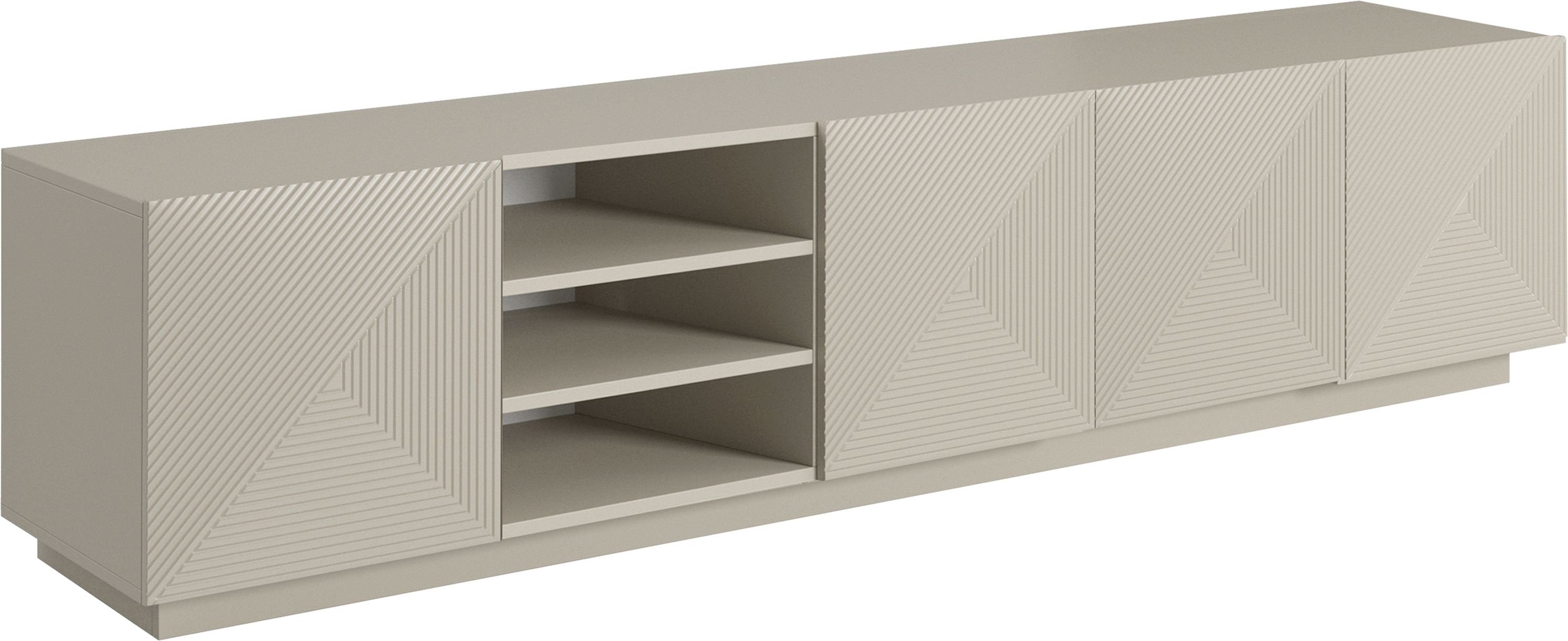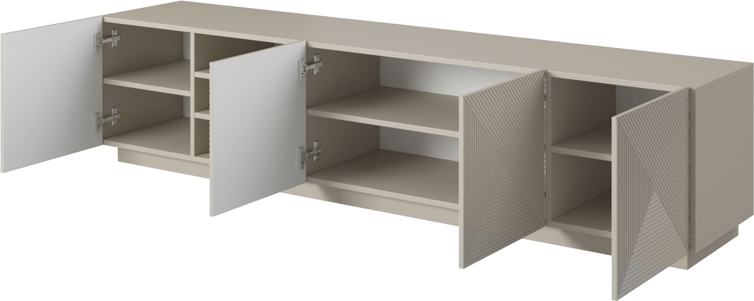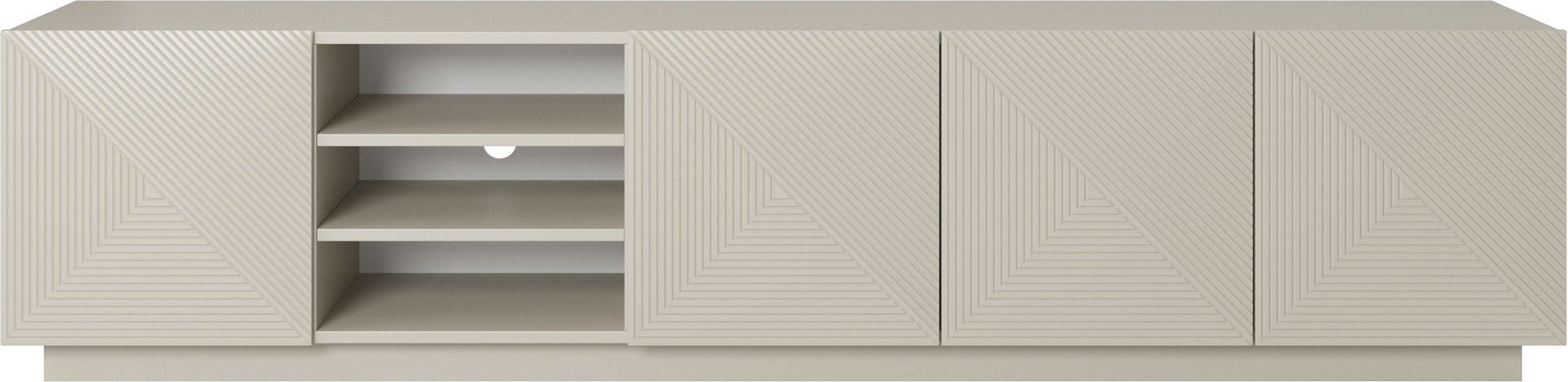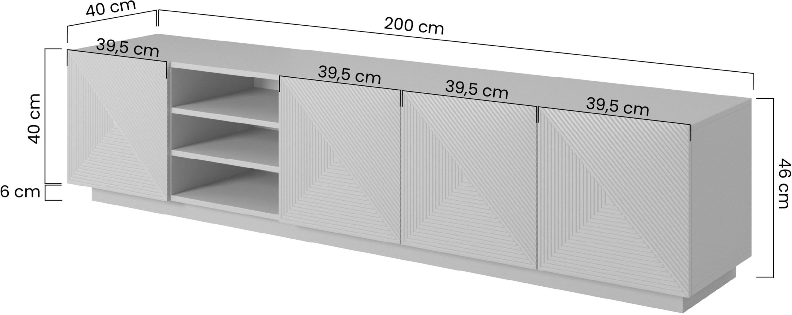 TV komoda na postolju Asha 200 5D – Bogart je profinjen komad namještaja, dizajniran za moderne dnevne sobe, gdje se funkcionalnost spaja s minimalističkom estetikom. S dužinom od 200 cm, dubinom od 40 cm i visinom od 46 cm, ova komoda nudi uravnotežen omjer između prostranosti i vizualne lakoće. Njezina površina u elegantnoj nijansi kašmira dodaje prostoru toplinu i osjećaj smirenosti, a zahvaljujući neutralnom tonu lako se uklapa s drugim bojama interijera.