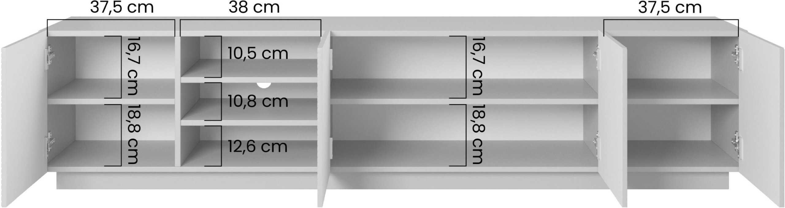 Unutrašnjost komode podijeljena je u više praktičnih pretinaca koji omogućuju organizirano pohranjivanje sitnih predmeta, multimedijskih uređaja ili dokumenata. Ravna gornja ploča nudi dovoljno prostora za televizor, zvučnike, dekoracije ili obiteljske fotografije. Zbog svoje visine komoda ne djeluje masivno, već zadržava prozračan izgled dnevne sobe.