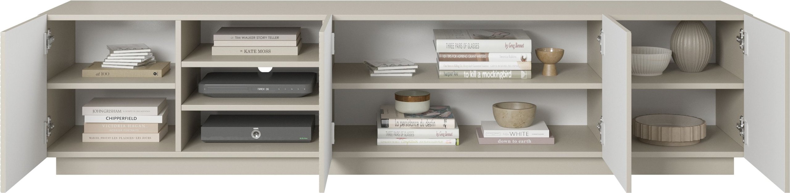 TV komoda Asha 200 5D odlično se uklapa s ostalim elementima iste kolekcije ili s minimalističkim namještajem u sličnim tonovima. Zbog svoje umjerene visine i dužine, prikladna je za prostrane dnevne sobe, ali se može koristiti i kao niska jedinica za pohranu u predsoblju ili spavaćoj sobi. Njezine čiste linije i neutralna boja omogućuju da se stopi s okolinom bez preuzimanja pažnje, a istovremeno djeluje kao elegantan naglasak modernog interijera.