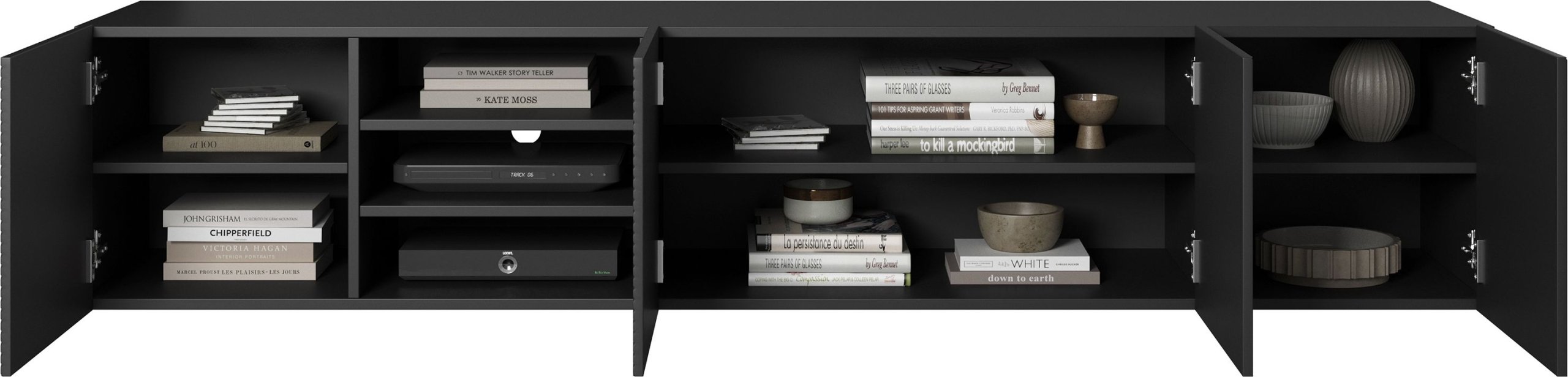 Cijela komoda dizajnirana je u crnom mat nijansi, koja djeluje elegantno, bezvremenski i odlično se slaže s brojnim kombinacijama boja. Crna površina naglašava strukturu materijala i omogućuje zanimljiv kontrast s drugim elementima u prostoru, poput svijetlih zidova, drvenih detalja ili metalnih dodataka. Fronte imaju suptilnu urezanu obradu koja komodi daje dodatnu dubinu i estetsku dinamiku, a da pritom ne gubi minimalistički karakter.