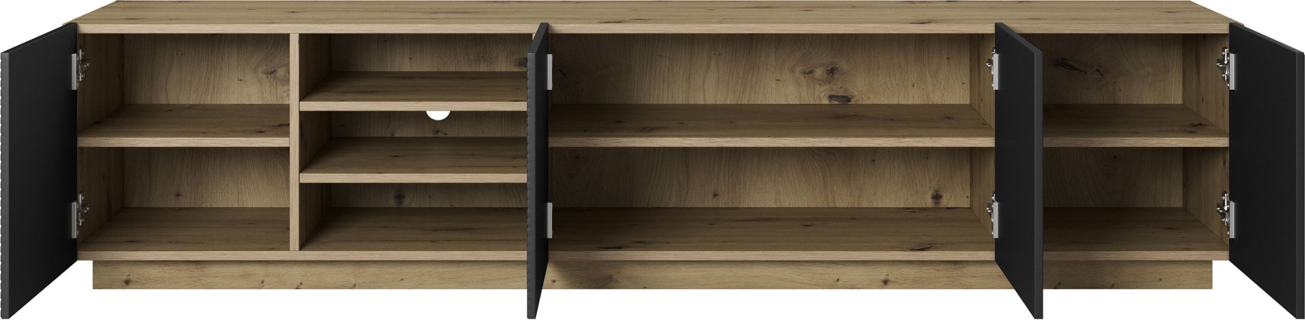 Stabilno postolje, koje zamjenjuje klasične noge, osigurava čvrstu potporu i minimalistički izgled. Takav dizajn idealan je za moderne dnevne boravke, gdje se naglasak stavlja na čiste linije i uredne površine. Komoda nudi više zatvorenih odjeljaka i otvorenih polica, koje omogućuju pohranu različitih predmeta – od elektronike i kablova do dekorativnih dodataka. Zahvaljujući promišljenom unutarnjem rasporedu, moguće je jednostavno održavati red i estetski izgled prostora.