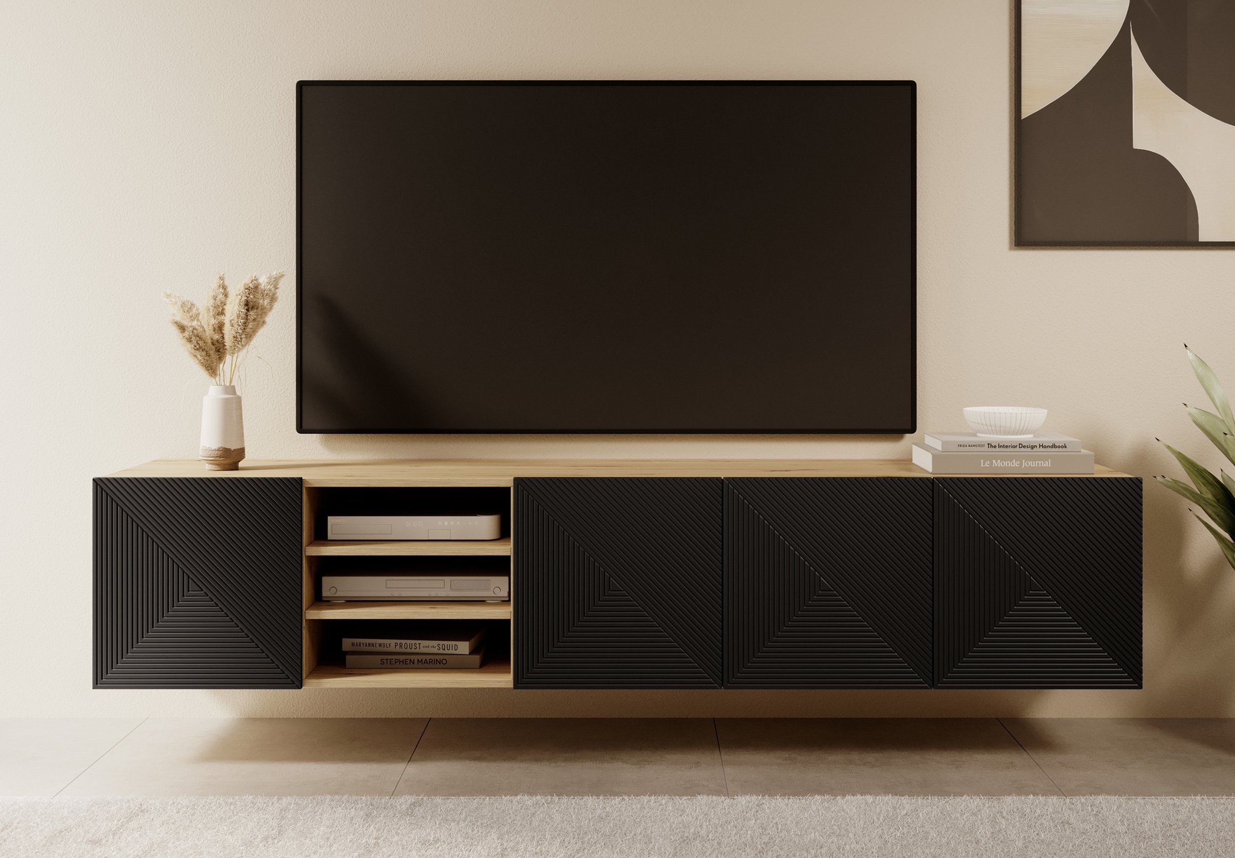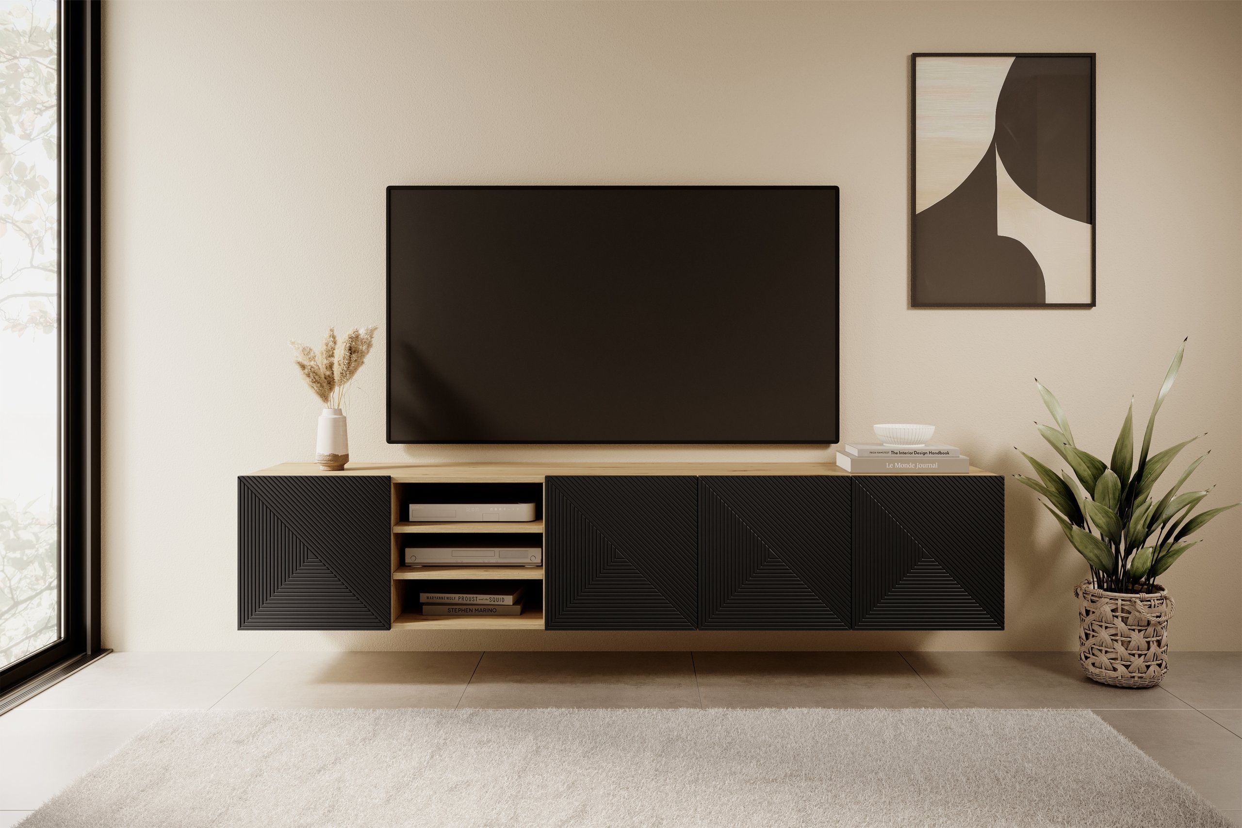 Viseća TV komoda Asha 200 5D idealan je izbor za dnevne sobe u kojima želite zadržati čist izgled i maksimalno iskoristiti prostor. Zbog visećeg dizajna komoda ne zauzima podni prostor, što prostoru daje lakoću i suvremenu estetiku. Pet odvojenih pretinaca omogućuje pregledno spremanje različitih predmeta – od igraćih konzola i DVD reproduktora do knjiga ili dekorativnih dodataka. Gornja površina prikladna je za televizor ili ukrasne elemente poput slika i biljaka.