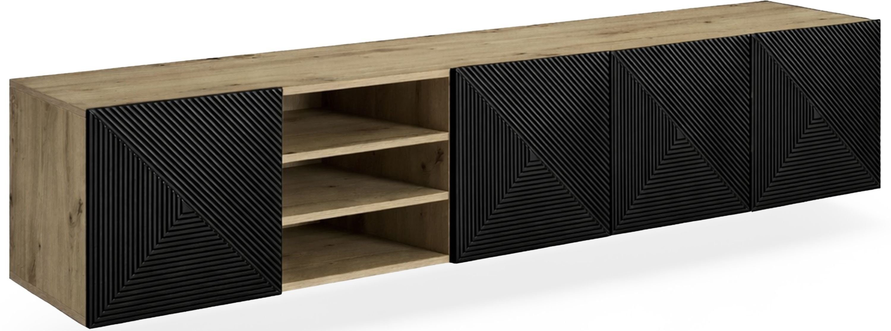 Zidna TV komoda s policama Asha 200 5D moderan je komad namještaja koji spaja elegantan dizajn i praktičnu funkcionalnost. Dizajnirana je u kombinaciji boja crna/hrast artisan, koja stvara ugodan kontrast i lijepo se uklapa u različite unutarnje stilove – od minimalističkog do industrijskog. Komoda je bez ručki, što naglašava njezin čist i moderan izgled, a sustav otvaranja na pritisak omogućuje udobnu svakodnevnu upotrebu. Izrađena je u tvornici Bogart u Poljskoj, gdje se tradicija kvalitetne izrade susreće s preciznom obradom detalja.