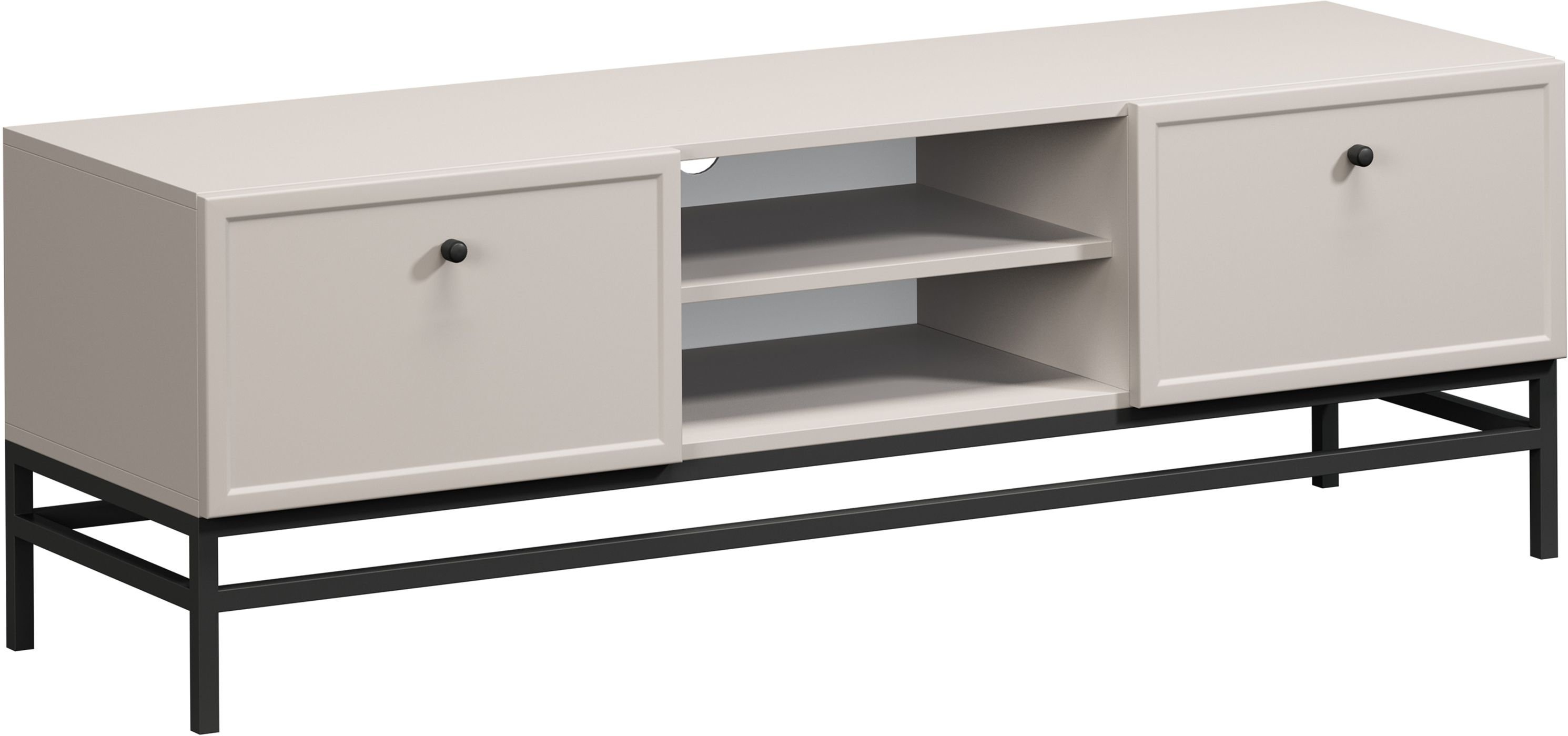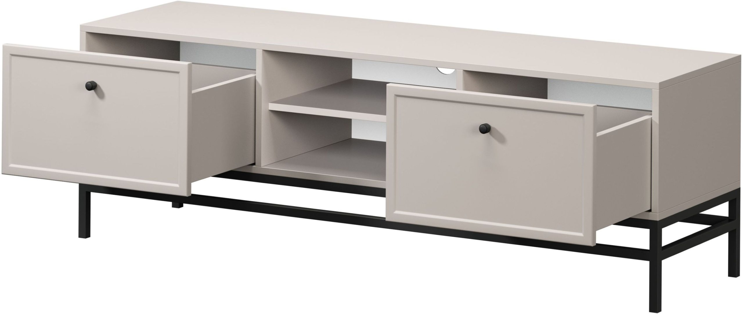 Komoda ima dvije prostrane ladice i dvije otvorene odlagalne niše, što omogućuje pregledno pohranjivanje multimedijskih uređaja, knjiga ili dekoracija. Ladice se zatvaraju s soft‑close mehanizmom, koji sprječava naglo zatvaranje i produžuje vijek trajanja vodilica. Vodilice su postavljene na donjoj strani, tako da unutrašnjost ladice ostaje estetski čista i bez vidljivih metalnih dijelova. Sustav otvaranja je klasičan – s ručkama – što osigurava pouzdanu i udobnu upotrebu.