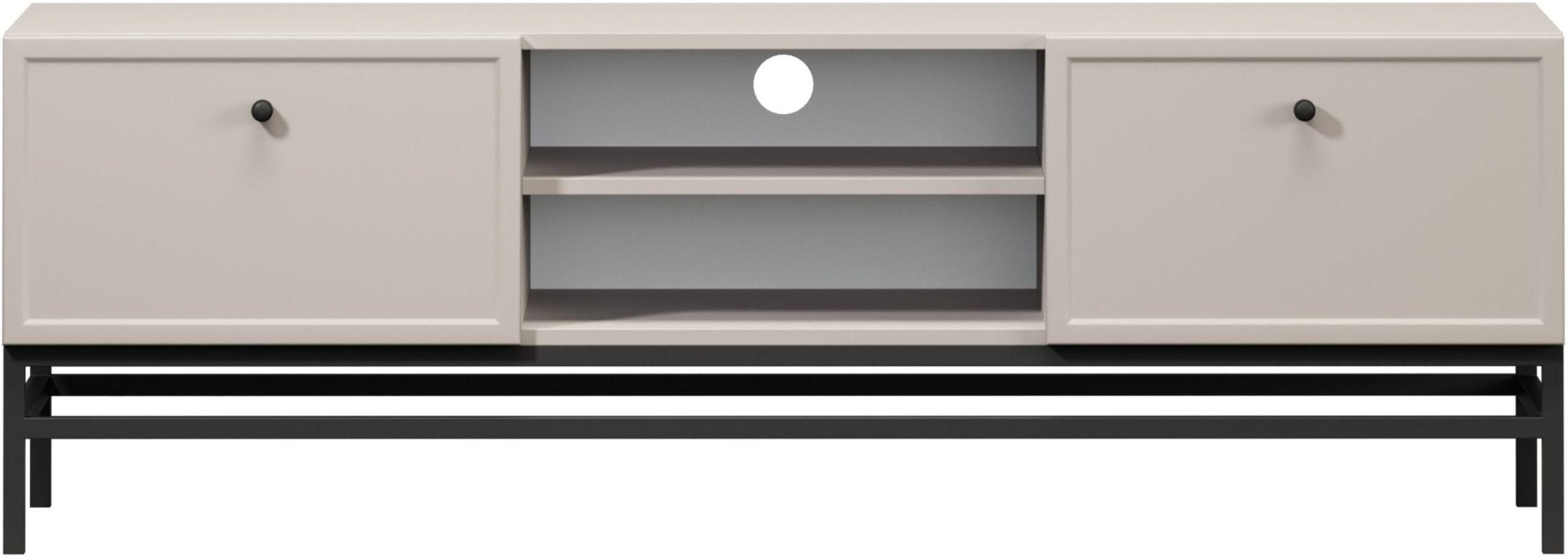 Cijela površina komode je u profinjenom tonu kašmira, koji u prostoru stvara osjećaj topline i smirenosti. Ova se boja odlično kombinira s neutralnim tonovima i prirodnim materijalima, pa komoda Lorini lijepo nadopunjuje dnevne sobe s drvenim ili metalnim namještajem. Ručke od čelika dostupne su u crnoj ili zlatnoj boji, što omogućuje suptilno prilagođavanje izgleda prema ostatku opreme. Metalne noge u obliku okvira praškasto su lakirane u crnu boju i osiguravaju stabilnost te vizualnu lakoću.