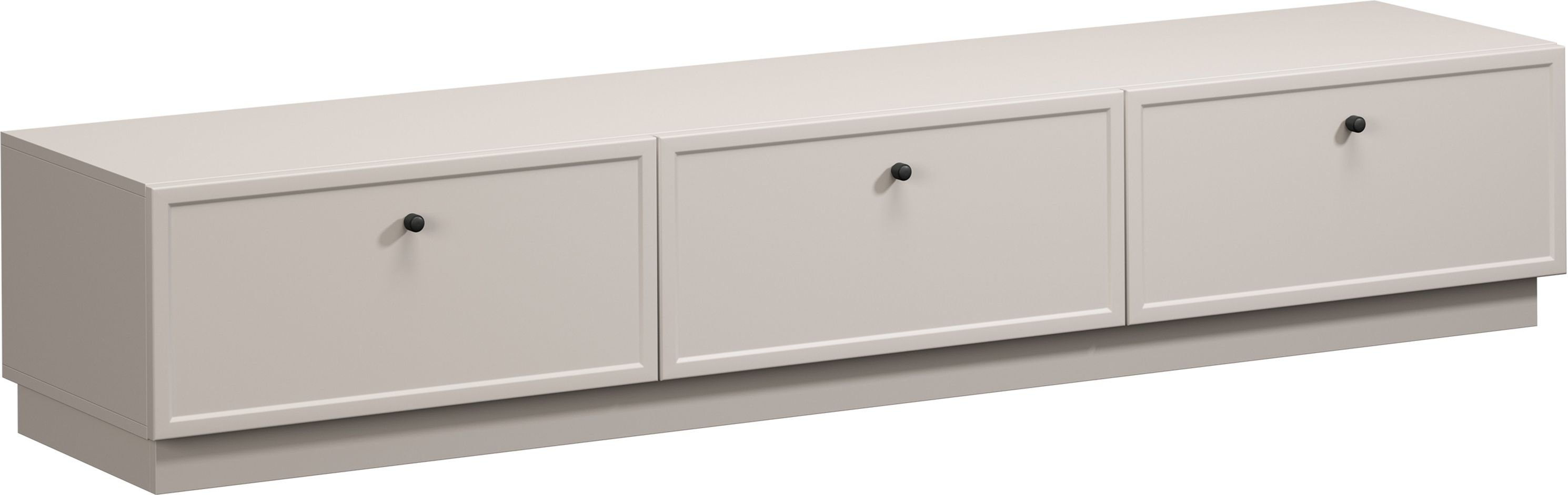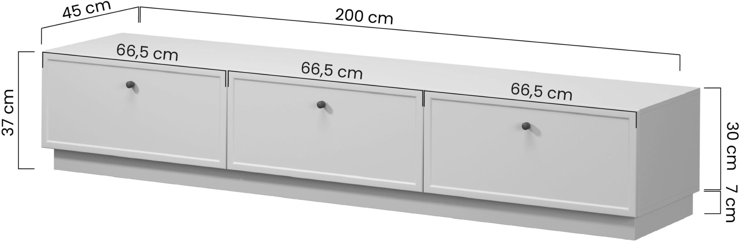 Umjesto klasičnih nogu, komoda ima stabilan cokl, koji daje namještaju dojam masivnosti i čvrstoće. Takva konstrukcija omogućuje jednostavno čišćenje oko namještaja, a istovremeno smanjuje nakupljanje prašine ispod njega. Cokl vizualno povezuje donji dio komode s podom, što stvara skladan i uravnotežen izgled – idealan za suvremene minimalističke interijere.