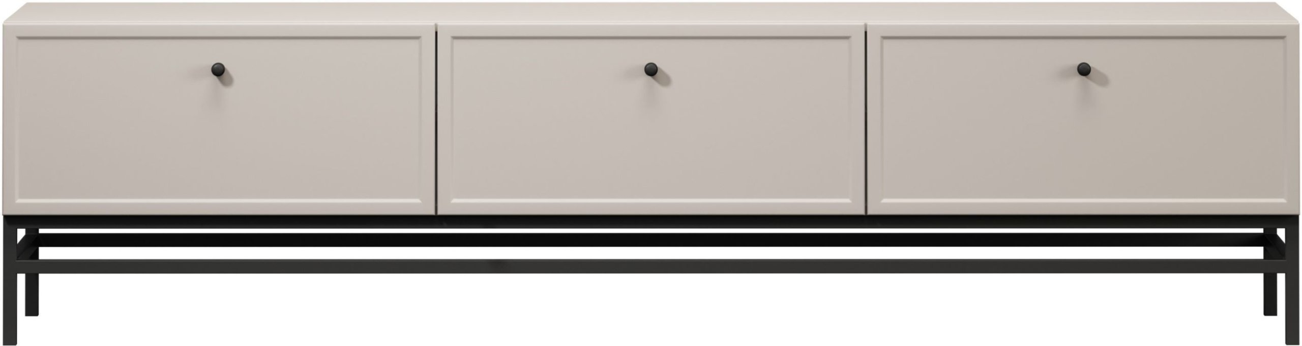 Cijela komoda dolazi u nježnoj nijansi kašmira, koja djeluje toplo i ugodno, a istovremeno se lako uklapa u brojne kombinacije boja suvremenih interijera. Metalne ručke dostupne su u crnoj ili zlatnoj izvedbi, što omogućuje suptilno prilagođavanje osobnom ukusu. Metalne noge u obliku okvira su crne boje i podižu komodu 20 cm od poda, što olakšava čišćenje ispod nje te daje komadu vizualnu lakoću.