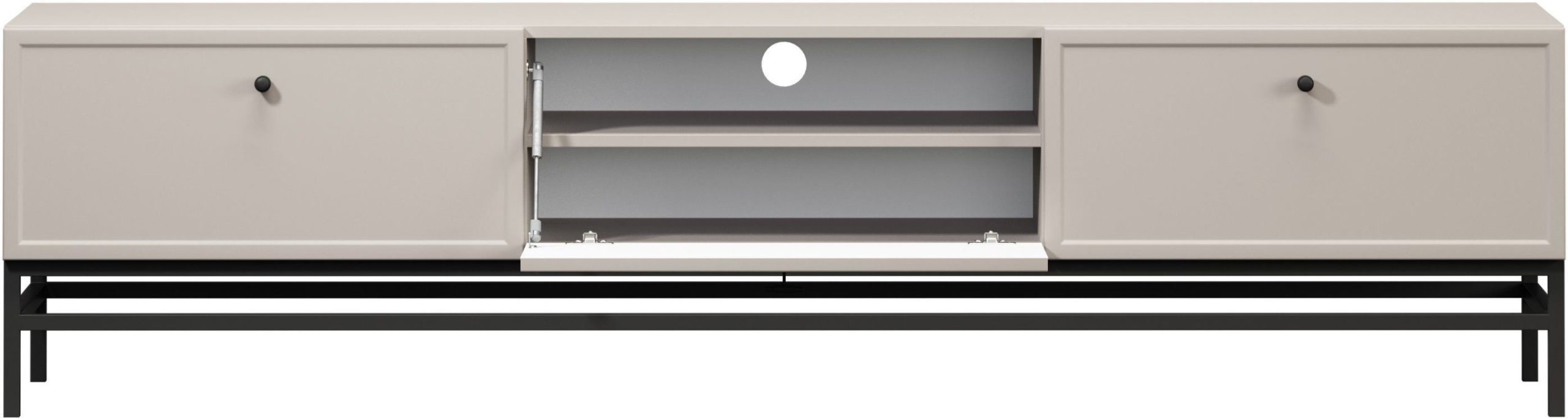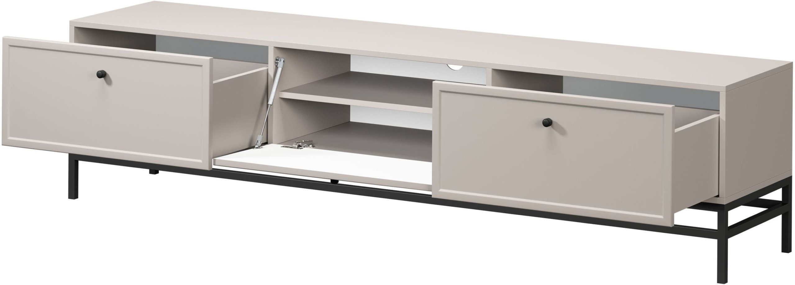 TV komoda Lorini uključuje dva prostrana ladica, jedan ormarić s vratima te jednu policu. Takav raspored omogućuje pregledno pohranjivanje svih komponenti kućnog kina, kablova, daljinskih upravljača ili dekorativnih predmeta. Ladice se otvaraju klasično pomoću ručki, a njihovo kretanje odvija se po vodilicama s mekanim zatvaranjem (soft‑close), koje osiguravaju tihu i ugodnu upotrebu.