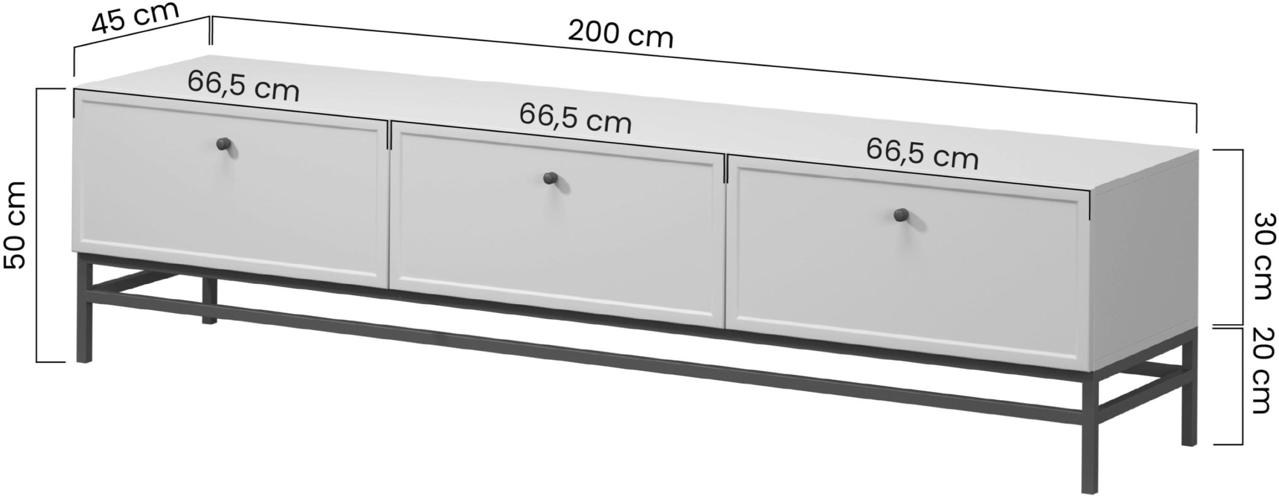 Komoda duljine 200 cm omogućuje postavljanje većeg televizora, a istovremeno nudi dovoljno prostora za druge predmete poput knjiga, ukrasnih dodataka ili kućnih audio sustava. Visina od 50 cm osigurava optimalnu visinu gledanja televizora s uobičajenog kauča, što povećava udobnost korištenja.