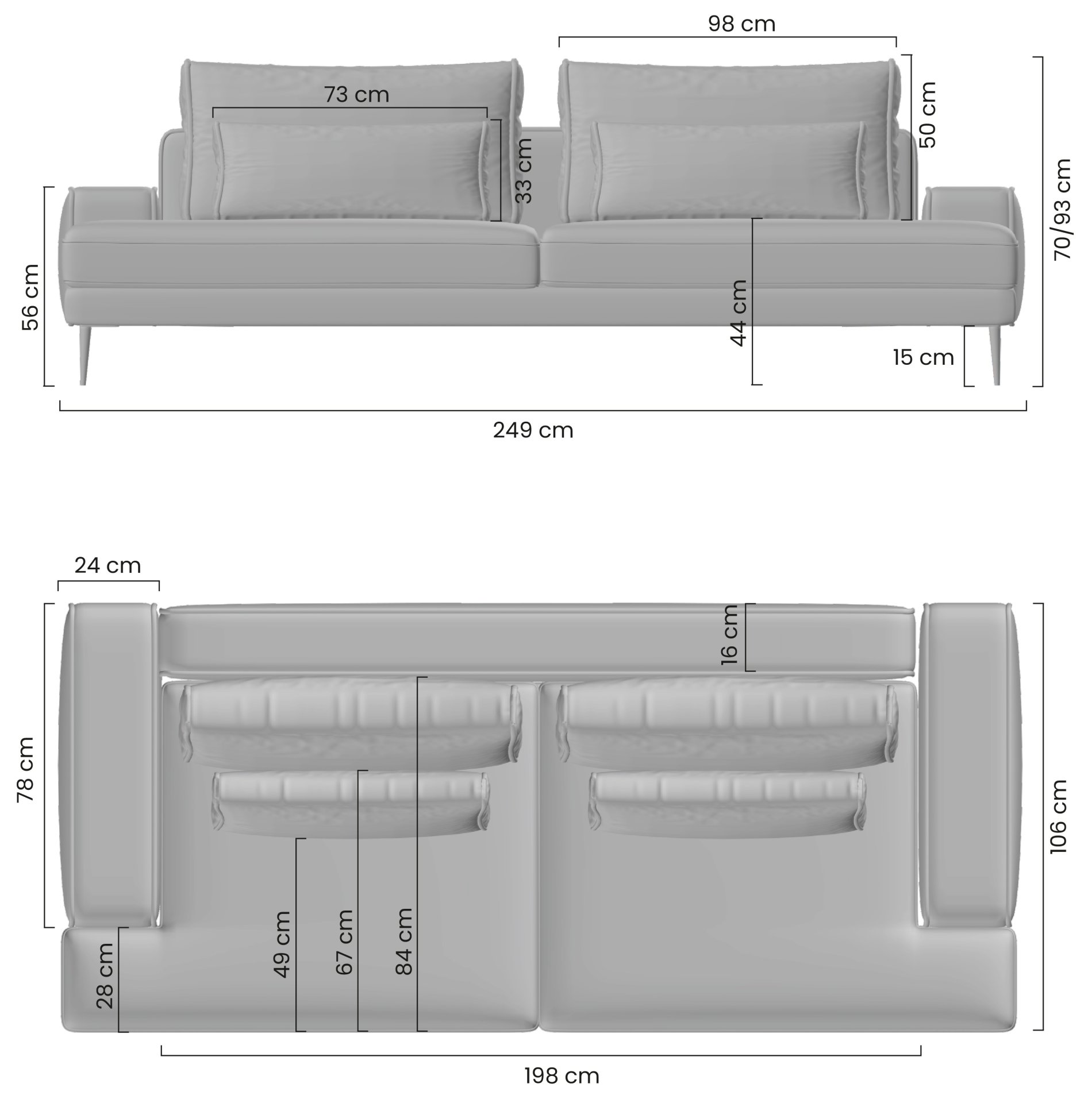 Trosjed Nicole predstavlja idealnu kombinaciju suvremenog dizajna i praktične upotrebe, što će vašem domu osigurati i estetsku privlačnost i udobnost. S dimenzijama 249x93x106 cm savršeno se uklapa u moderne stambene prostore, a istovremeno nudi dovoljno prostora za opuštanje i druženje s obitelji ili prijateljima.