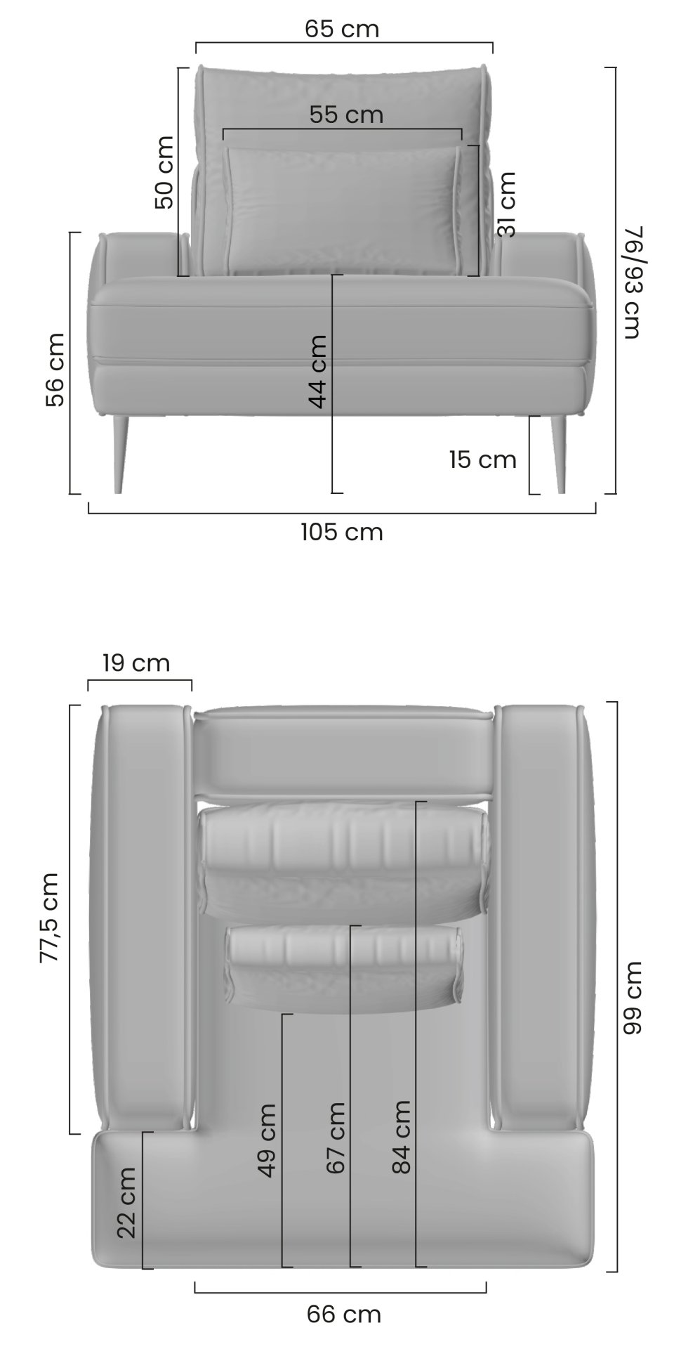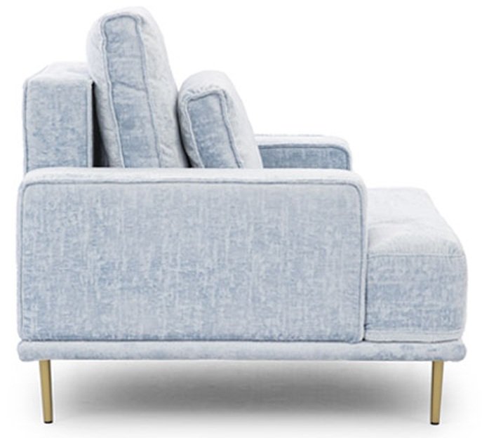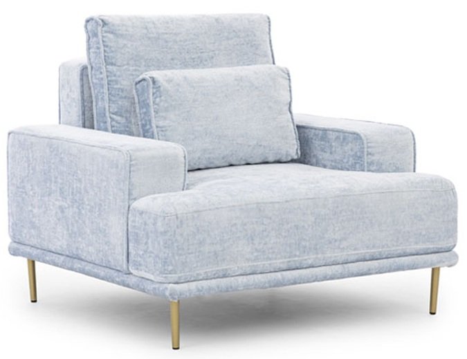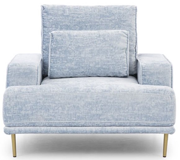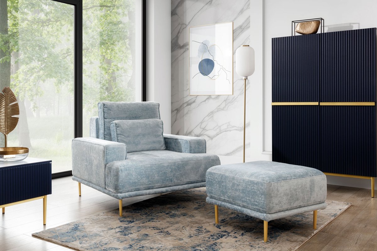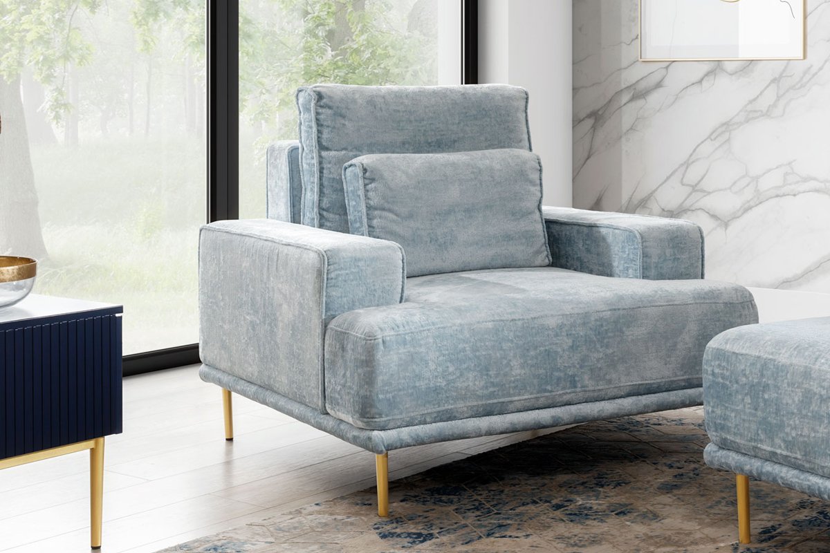 Fotelja Nicole može se pohvaliti modernim dizajnom koji se bez problema uklapa u svaki prostor. Njezine dimenzije 105x99x93 cm osiguravaju pravi omjer prostranosti i kompaktnosti. Okvir od drveta i iverice osigurava stabilnost i dug životni vijek, dok tkanina Miu 2052 dodaje dašak profinjenosti i mekoće. Metalne, zlatne noge, visoke 15 cm, ne samo da naglašavaju elegantan izgled, već i omogućuju jednostavno čišćenje ispod fotelje, što je izvrsno za svakodnevnu upotrebu.