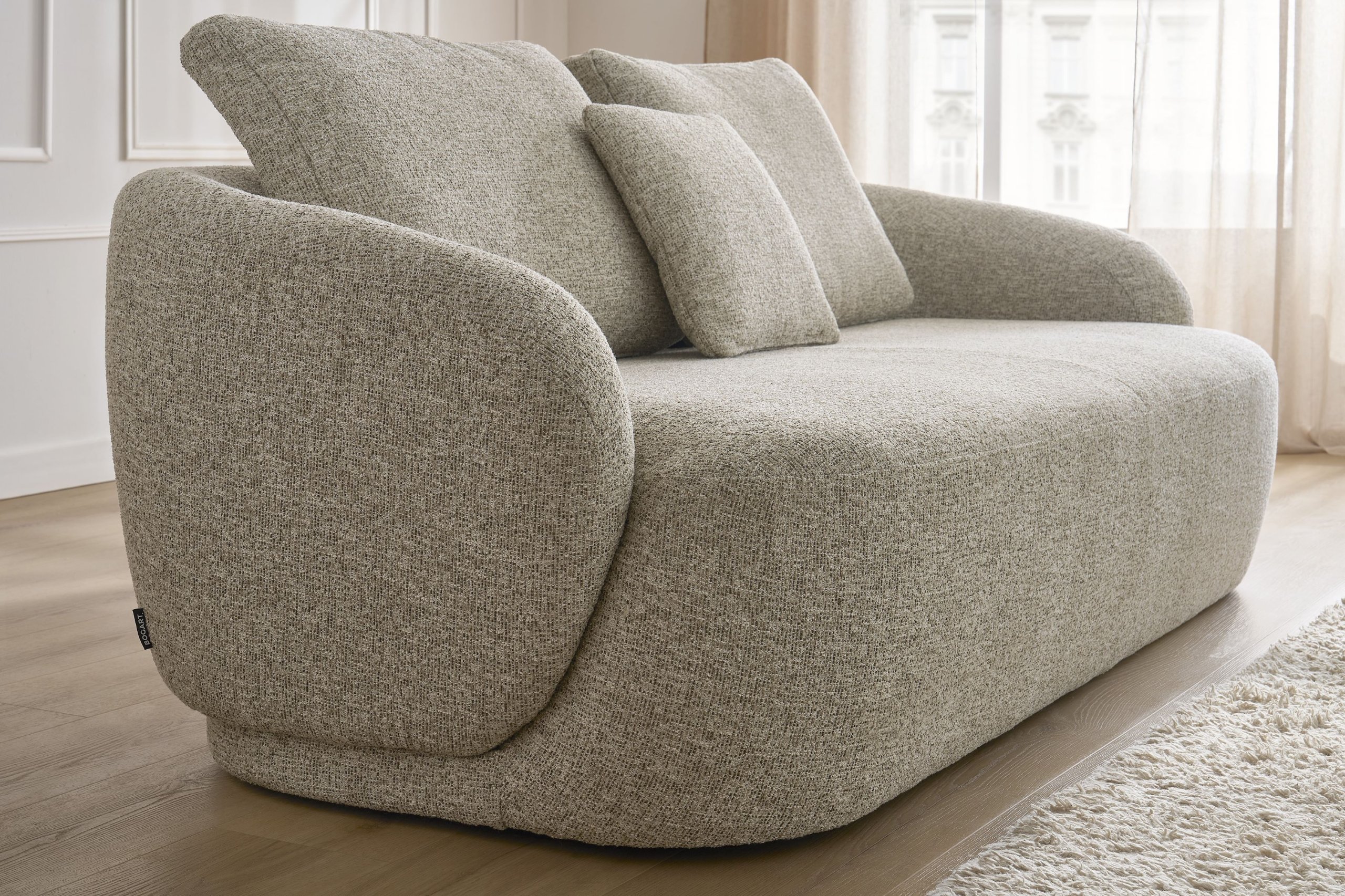 Okvir trosjeda izrađen je od drveta i iverice, što znači dobru stabilnost i istovremeno relativno laganu konstrukciju. Zbog te kombinacije komad namještaja je izdržljiv, a ujedno i jednostavan za premještanje po prostoru. Noge su izrađene od plastike, što osigurava stabilnu potporu i istovremeno sprječava oštećenje podnih obloga. Crna boja nogu diskretno nadopunjuje dekor tkanine, bez obzira na odabranu boju presvlake.