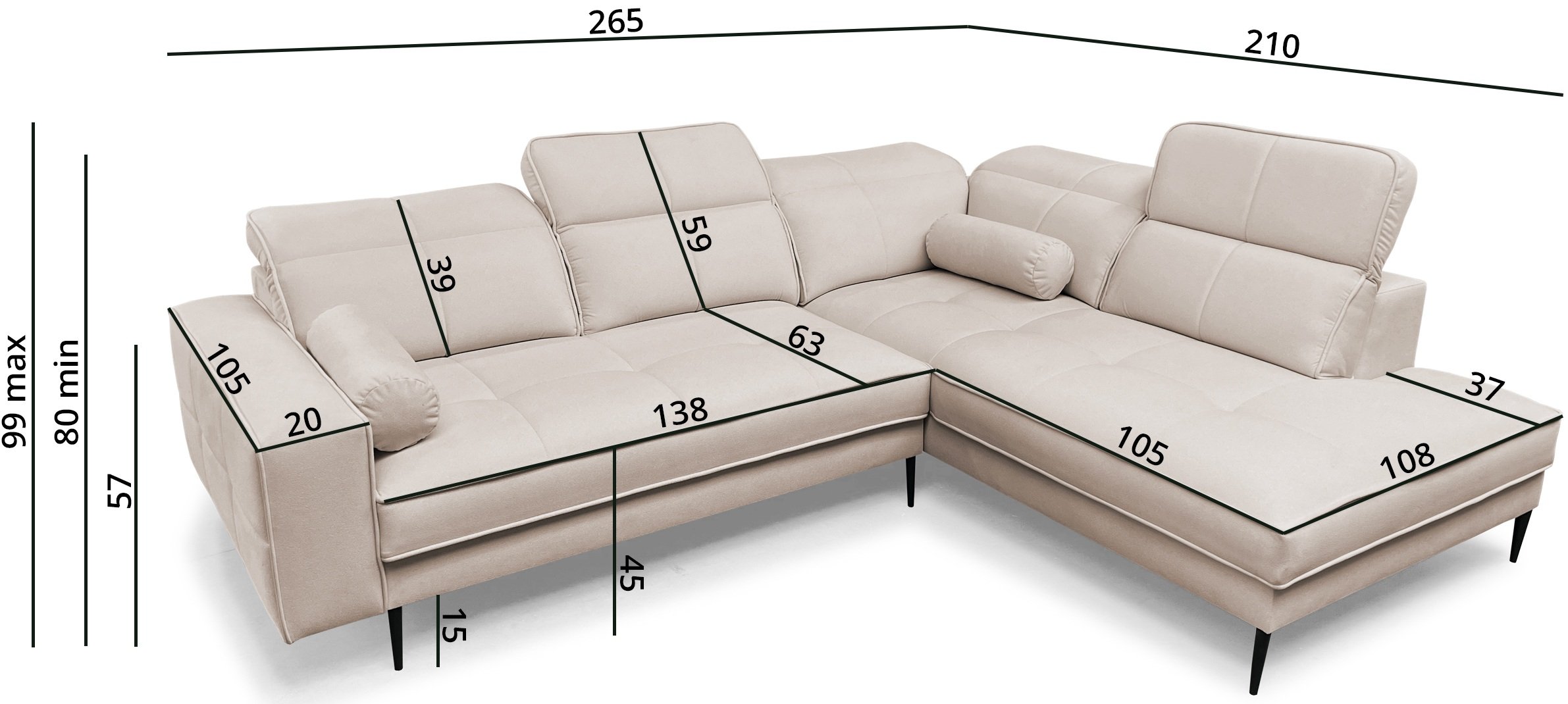 Dimenzije garniture (265 x 210 x 99 cm) omogućuju da se udobno smjesti u veće i srednje velike dnevne sobe, gdje će postati središnji element prostora. Zbog svog dizajna prikladna je za obitelji, parove ili sve koji žele kvalitetnu i estetski dovršenu garnituru za sjedenje.