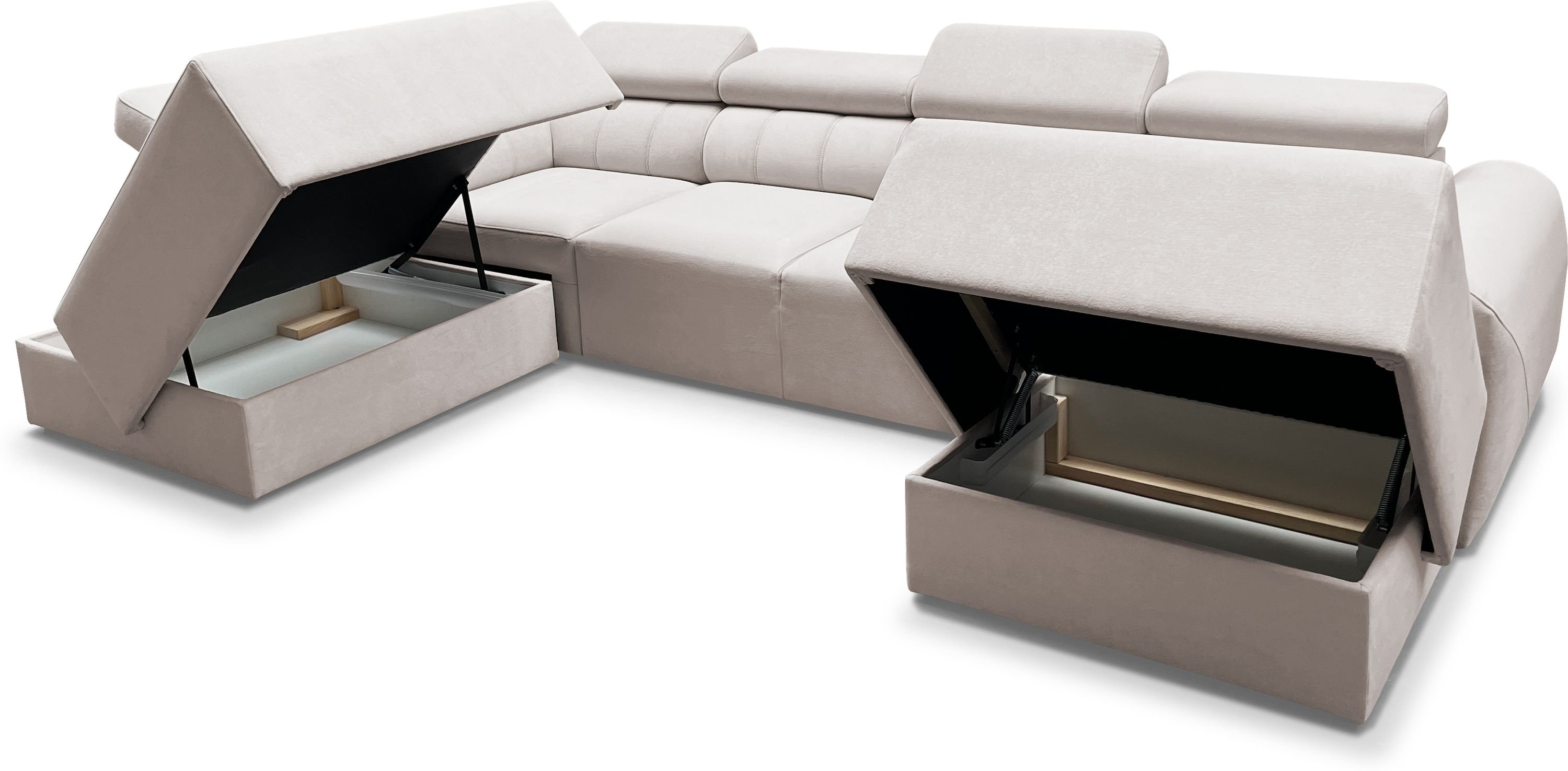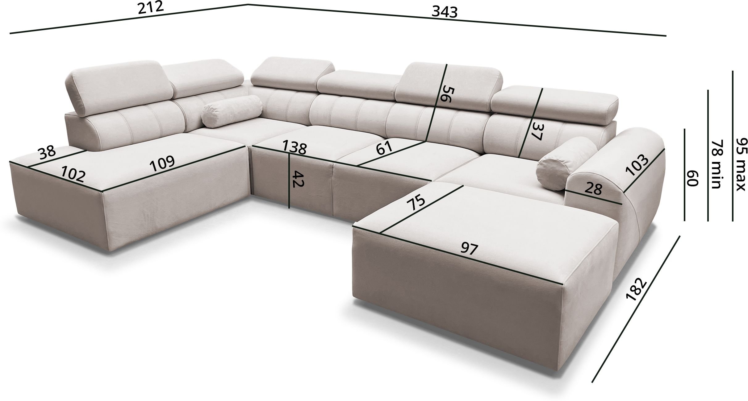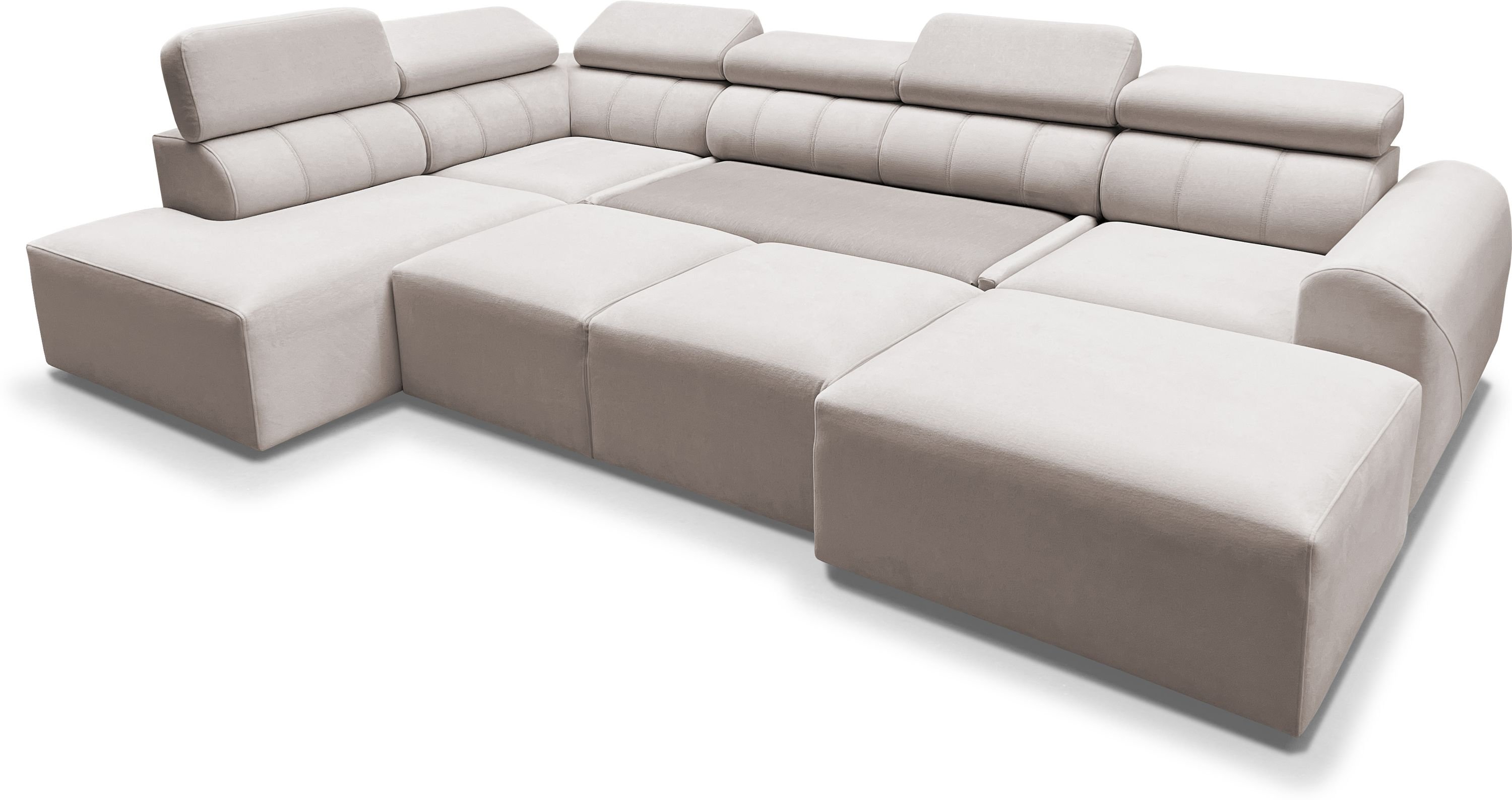 Kutna garnitura u obliku slova U Volare VI marke Brattex ističe se svojom raskošnom dimenzijom 343x212x95 cm i suvremenim dizajnom, koji se lijepo uklapa u prostrane dnevne sobe. Proizvod je dizajniran u modernom stilu i proizveden u Poljskoj, što spaja kvalitetnu europsku izradu i estetsku dovršenost. Garnitura je opremljena s mehanizmom Dolphin, koji omogućuje brzo i jednostavno razvlačenje u ležaj veličine 268x132 cm. Osim toga, ima i dva prostrana ladice za posteljinu, što osigurava dodatnu funkcionalnost za pohranu.