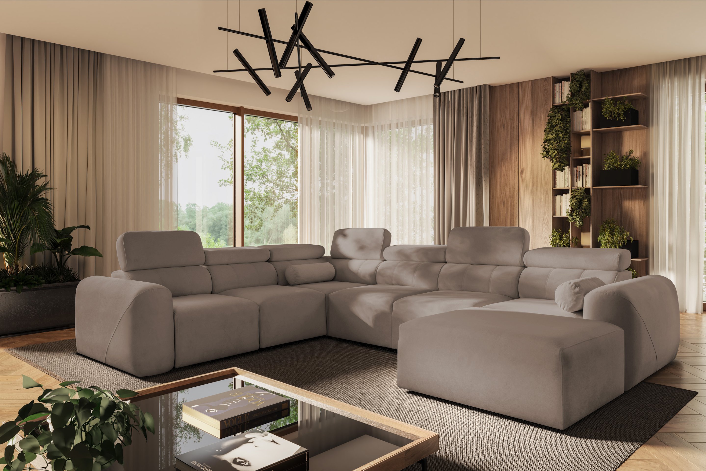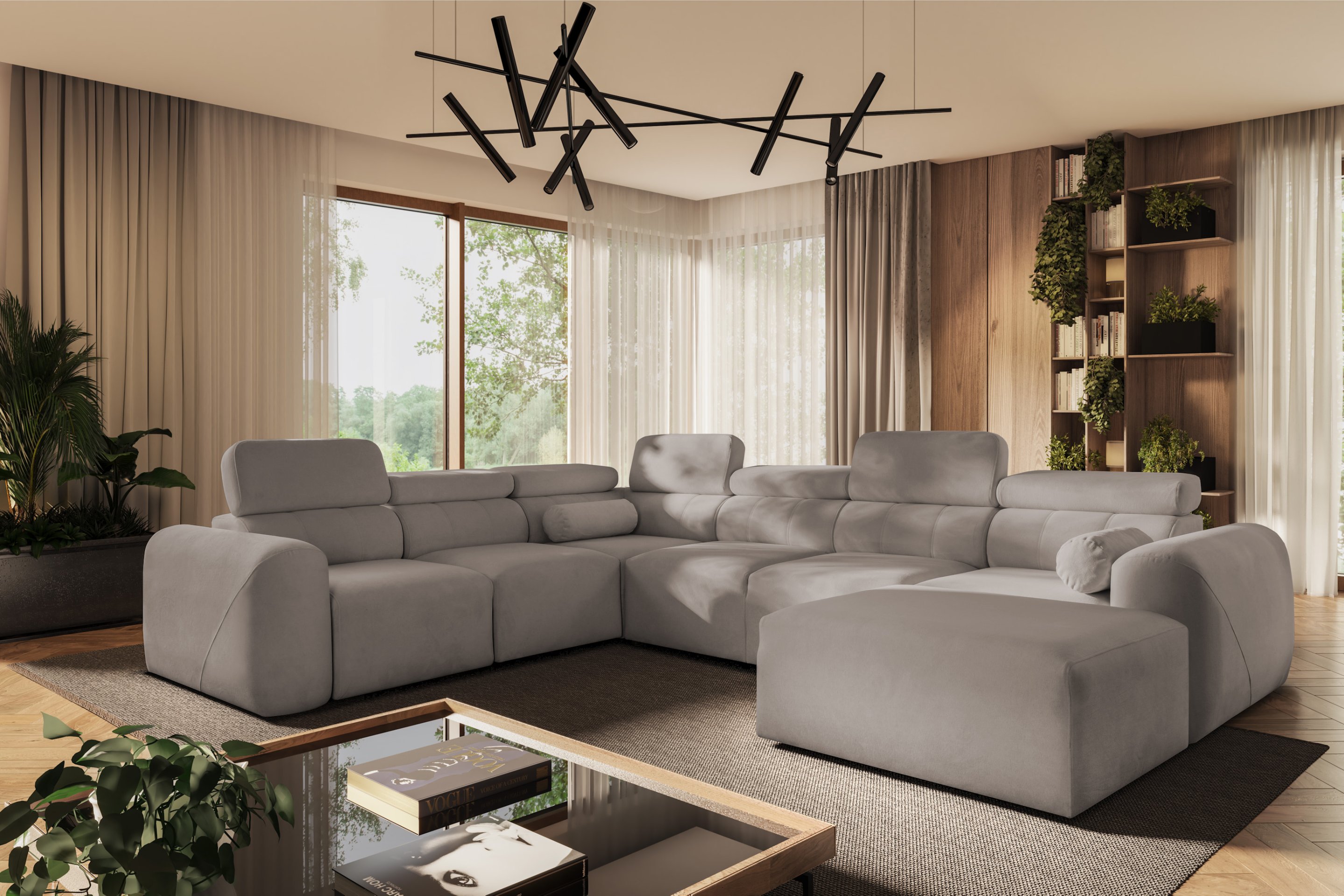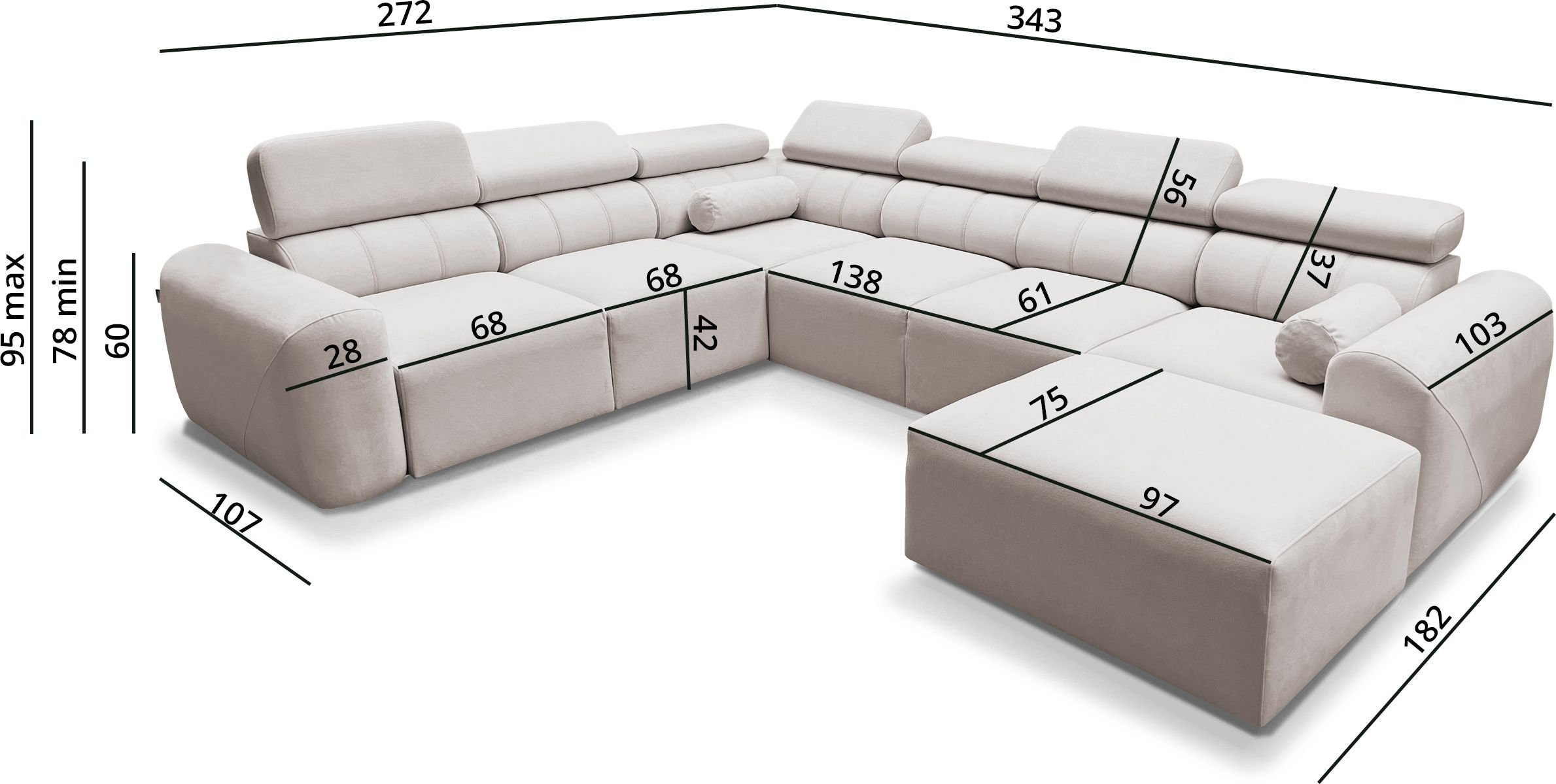 Kutna garnitura u obliku slova U Volare VIII marke Brattex ističe se svojom raskošnom dimenzijom 343x272x95 cm i modernim dizajnom, koji se lijepo uklapa u prostrane dnevne sobe. Proizvod je dizajniran u modernom stilu i proizveden u Poljskoj, što spaja kvalitetnu europsku izradu i estetsku dovršenost. Garnitura je opremljena s mehanizmom Dolphin, koji omogućuje brzo i jednostavno razvlačenje u ležaj veličine 268x132 cm. Osim toga, ima i dva prostrana spremnika za posteljinu, što osigurava dodatnu funkcionalnost za pohranu.