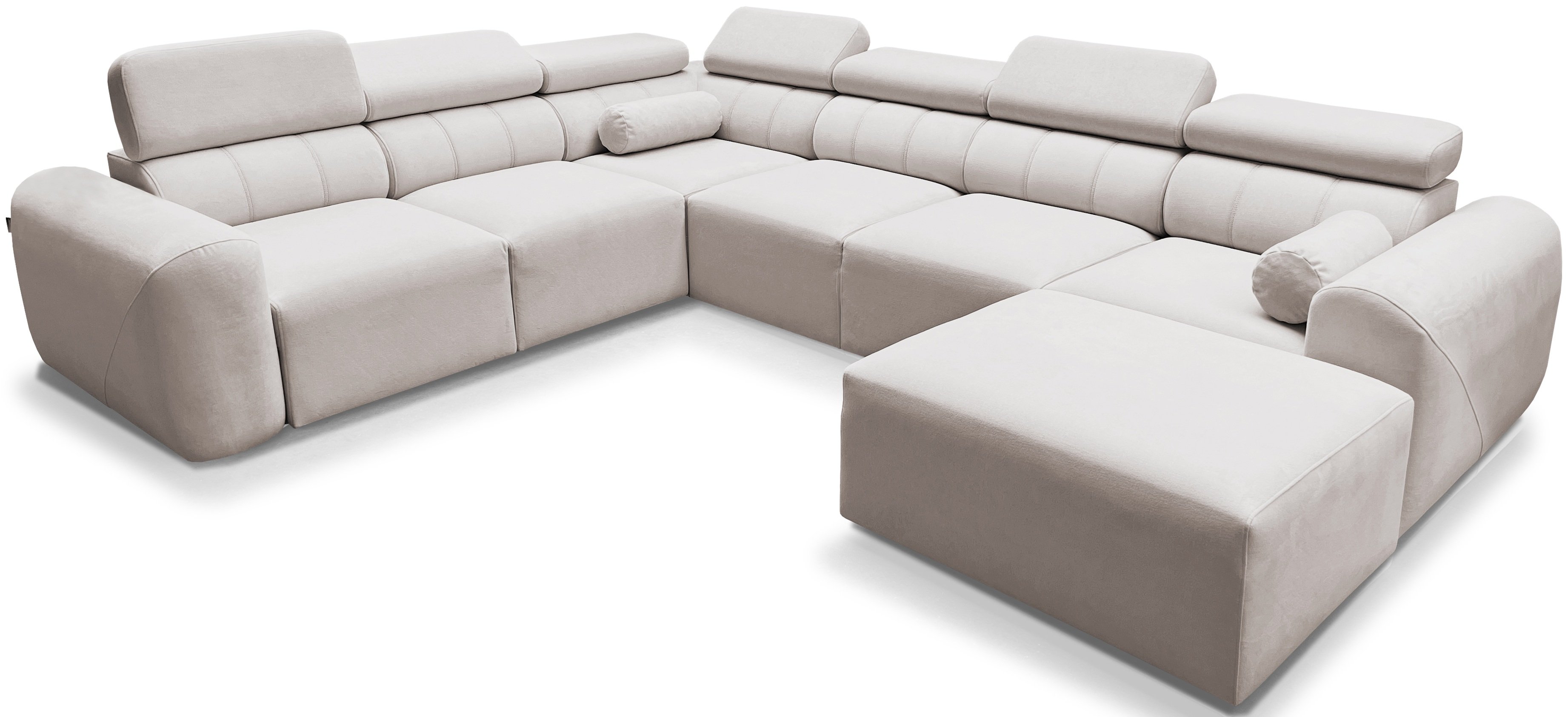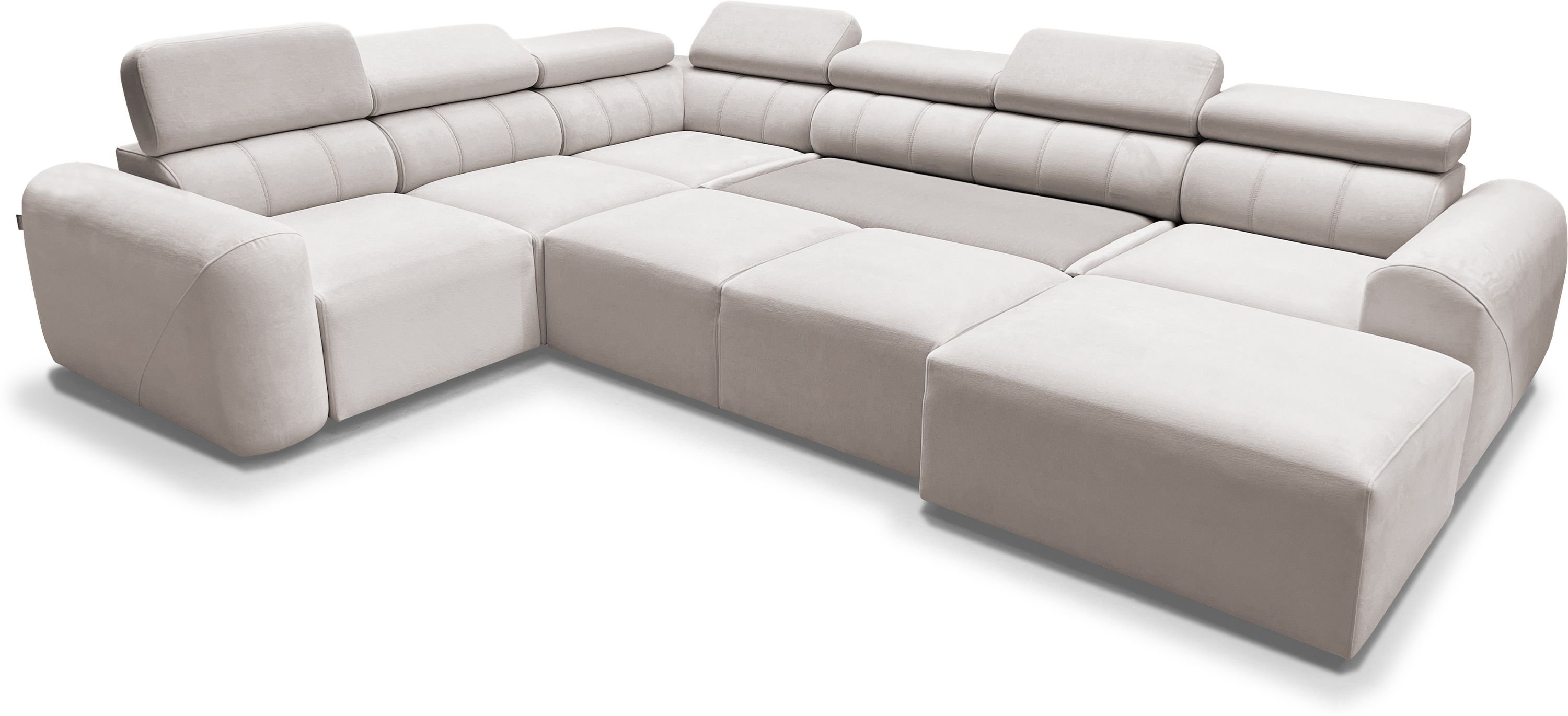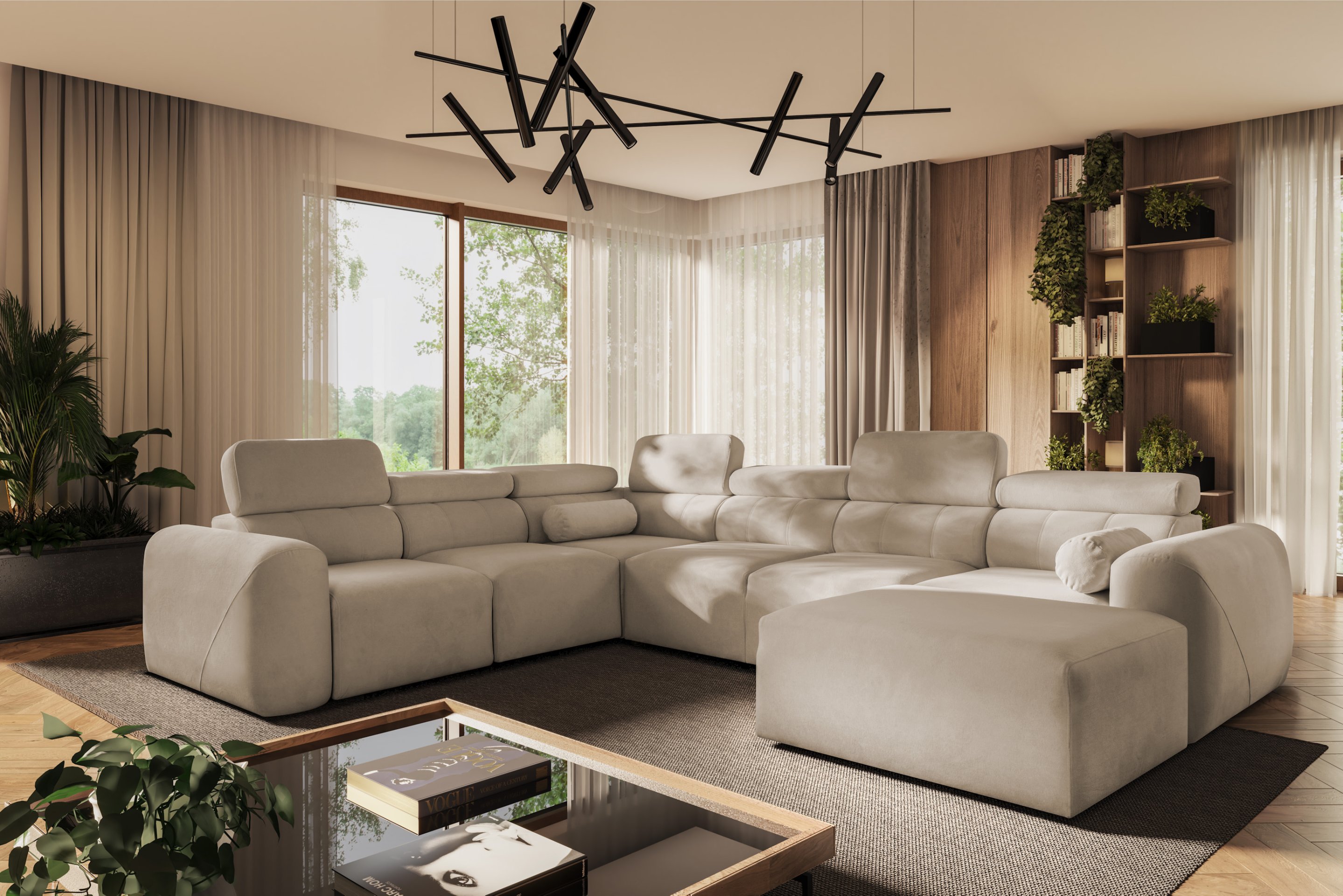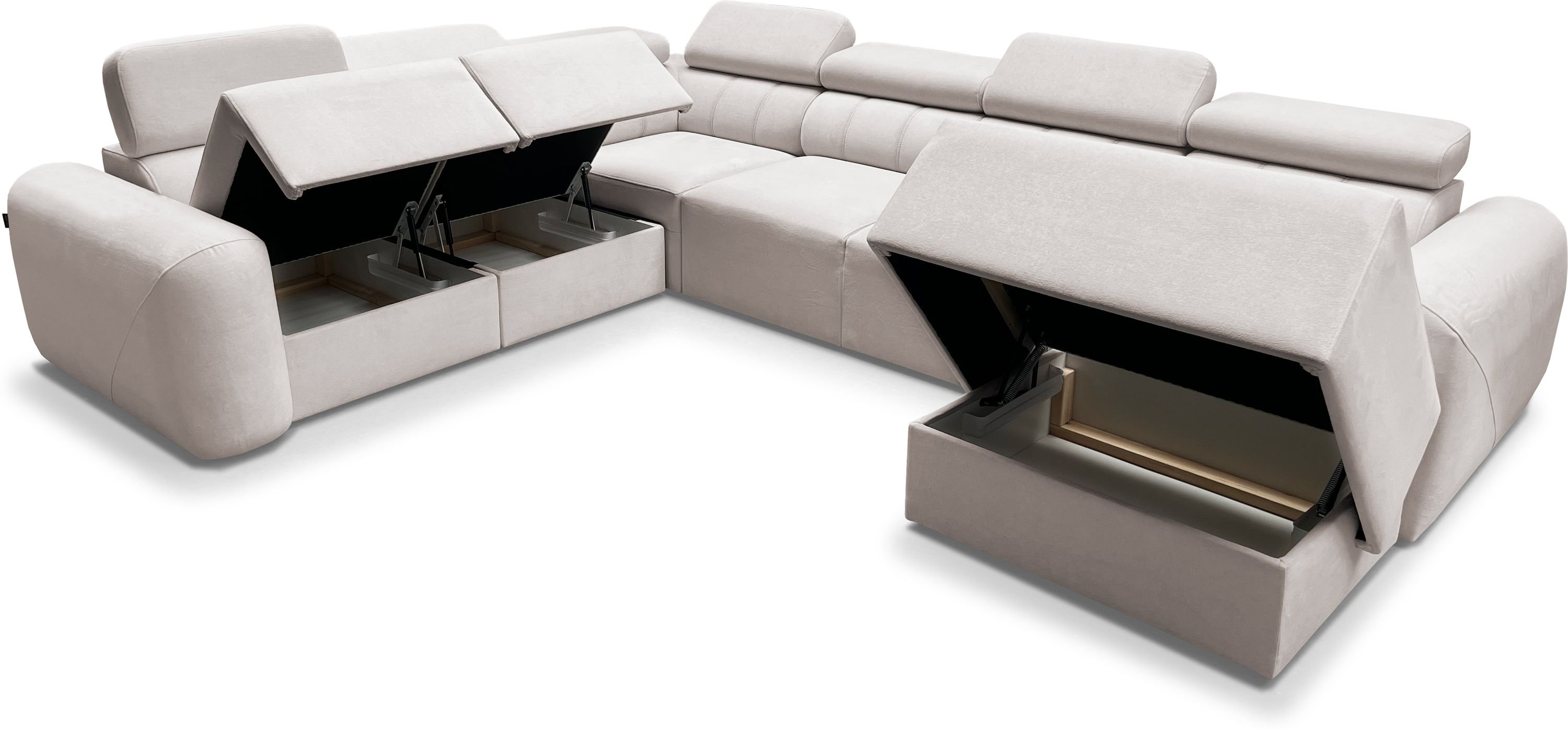 Kutna garnitura u obliku slova U Volare VIII marke Brattex ističe se svojom raskošnom dimenzijom 343x272x95 cm i modernim dizajnom, koji se lijepo uklapa u prostrane dnevne sobe. Proizvod je dizajniran u modernom stilu i proizveden u Poljskoj, što spaja kvalitetnu europsku izradu i estetsku dovršenost. Garnitura je opremljena s mehanizmom Dolphin, koji omogućuje brzo i jednostavno razvlačenje u ležaj veličine 268x132 cm. Osim toga, ima i dva prostrana spremnika za posteljinu, što osigurava dodatnu funkcionalnost za pohranu.