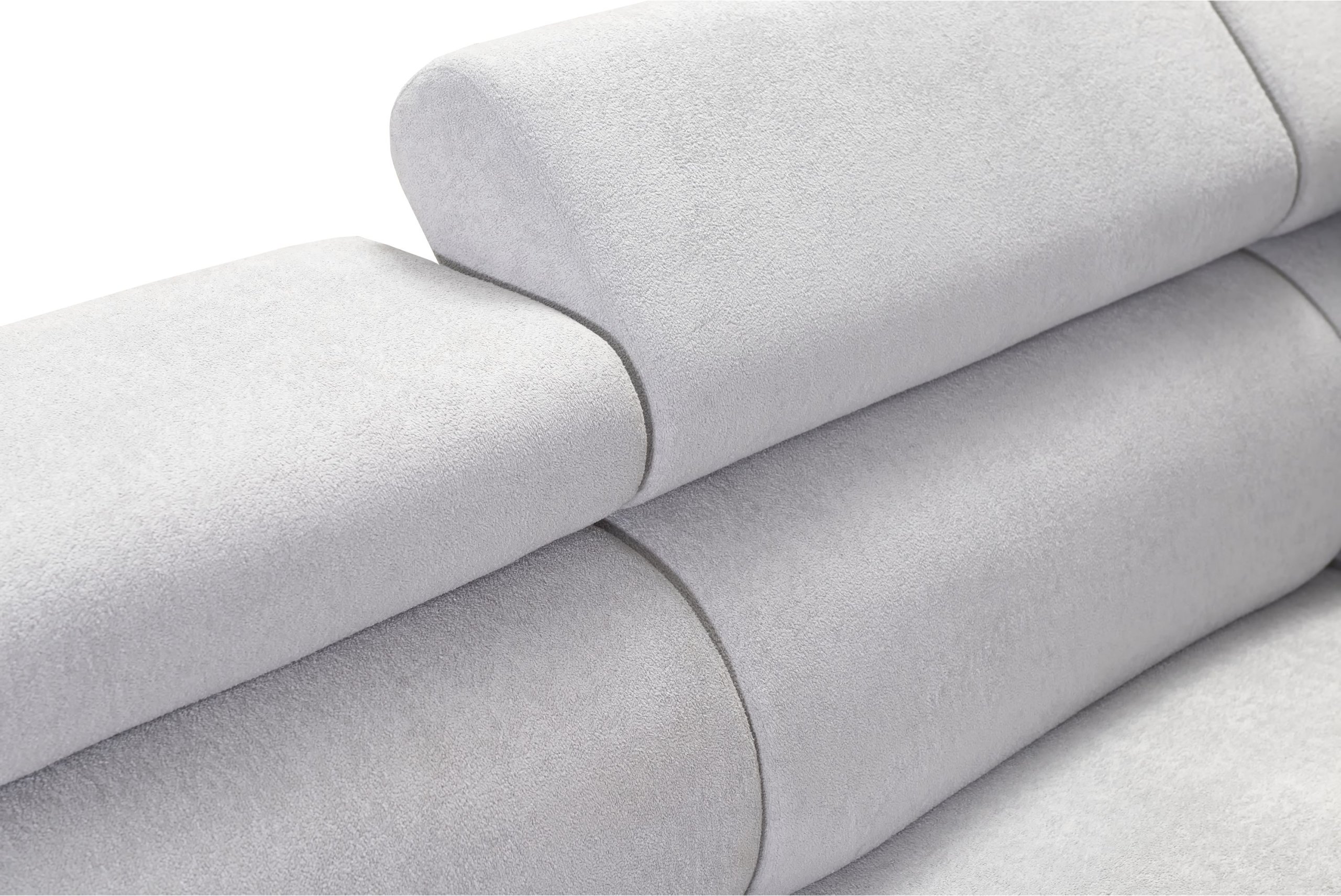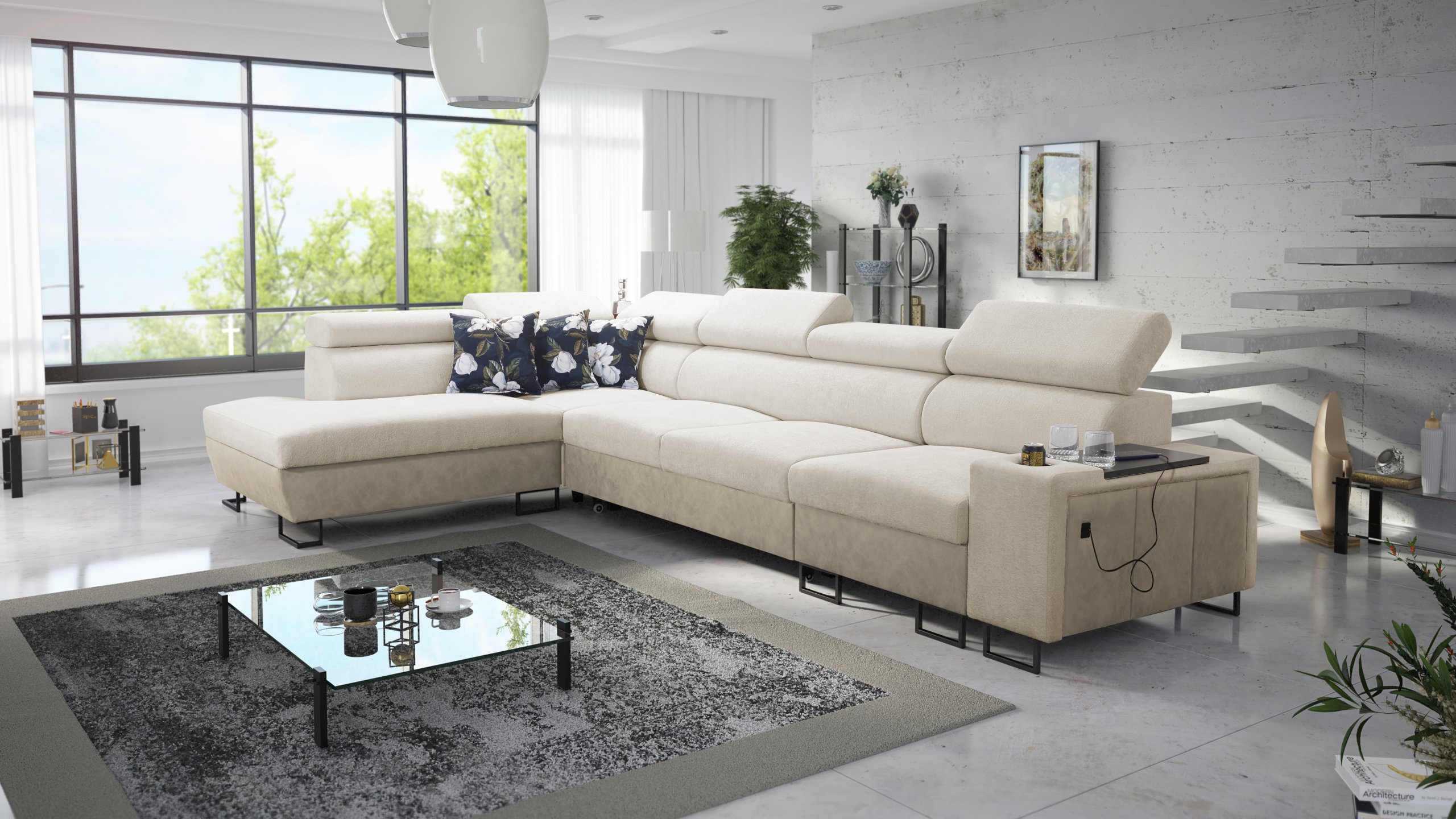 Ukupne dimenzije garniture iznose 350x220x100 cm, što znači da nudi mnogo prostora za opuštanje, a zahvaljujući promišljenom obliku lijepo se uklapa u većinu modernih dnevnih boravaka. Širina ležajne površine je 130 cm, što je dovoljno za udoban odmor jedne ili dvije osobe. Unatoč većim dimenzijama, garnitura je oblikovana tako da zadržava prozračan i uravnotežen izgled prostora.