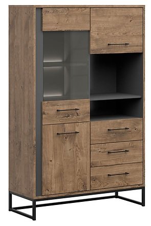 - Industrijski stil vitrine naglašavaju metalne noge i ručke mat crne boje. Hladni tonovi smeđeg hrasta ribbeck i sive grafitne nijanse se odlično nadopunjuj s ugrađenom LED rasvjetom koja u prostor unosi topao ugođaj. Zatamnjeno staklo naglašava sofisticiranost.