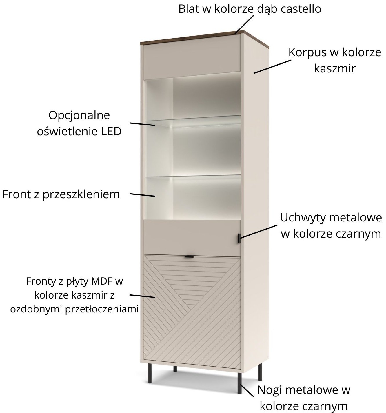 Izrađena od visokokvalitetne iverice, vitrina Evo nudi visoku otpornost i trajnost, što jamči dugogodišnje zadovoljstvo. Njezina kombinacija boja kašmir i castello hrast dodaje dašak elegancije i topline, koja se bez poteškoća usklađuje s različitim interijerima – od klasičnih do modernih. Ova koloristička shema omogućuje jednostavno kombiniranje s postojećim namještajem i dodacima, što znači da vitrina postaje središnji element svakog prostora.
