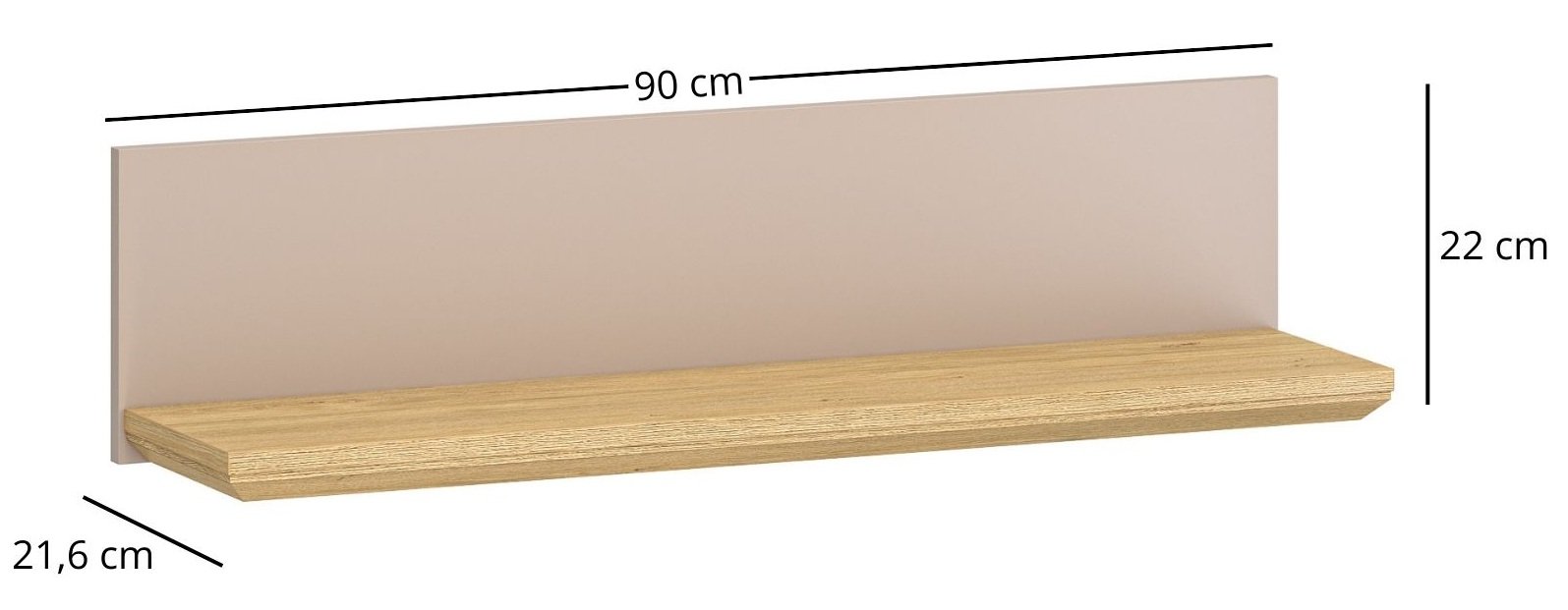 Zbog svoje širine od 90 cm polica nudi dovoljno prostora za postavljanje dekoracija, knjiga, fotografija ili manjih biljaka. Dubina od 21,6 cm omogućuje stabilno postavljanje predmeta, bez prevelikog zauzimanja prostora. Visina od 22 cm pridonosi uravnoteženom izgledu na zidu, bilo kao samostalan element ili u kombinaciji s drugim policama iz iste kolekcije.