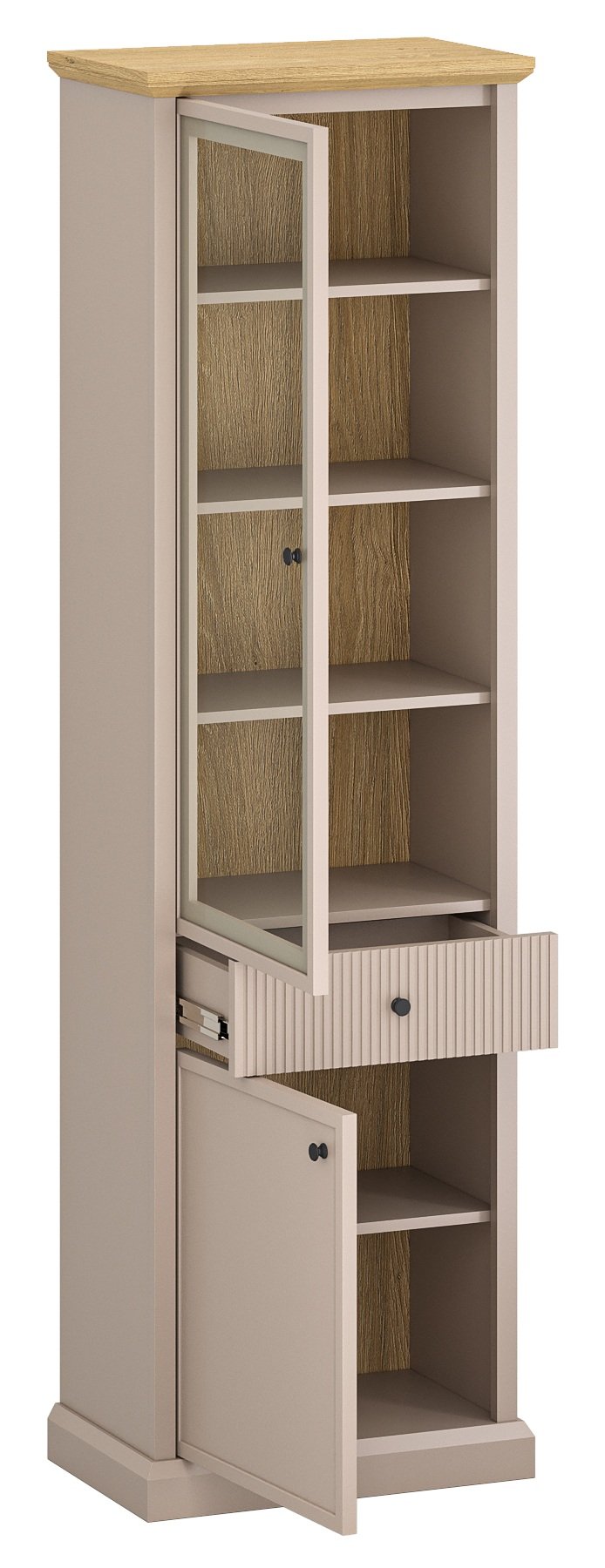 Serija Idello dizajnirana je tako da omogućuje kombiniranje više komada u jedinstven interijer. Vitrina Idello 1d1w1s može se savršeno uskladiti s drugim ormarićima, komodama ili TV jedinicama iz iste kolekcije. Nijansa taupe i dekor hrasta kamenog stvaraju harmoničan prijelaz između topline drva i modernog minimalizma. Takva kombinacija omogućuje da se vitrina lijepo uklopi u različite unutarnje stilove – od skandinavskog do urbanog ili klasičnog.