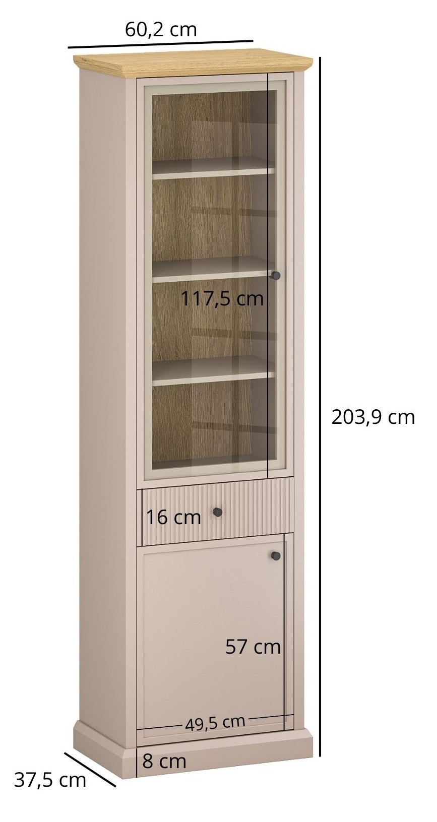 Vitrina mjeri 60x37,5x204 cm, stoga je prikladna i za manje prostore, gdje želite dobiti dodatnu visinsku površinu za pohranu bez osjećaja skučenosti. Zbog vitke siluete lijepo se uklapa uz zid ili u kombinaciji s drugim elementima iz programa Idello. S visinom od 204 cm nudi mnogo prostora za pohranu, a zahvaljujući uskoj dubini zadržava prozračan izgled prostora.
