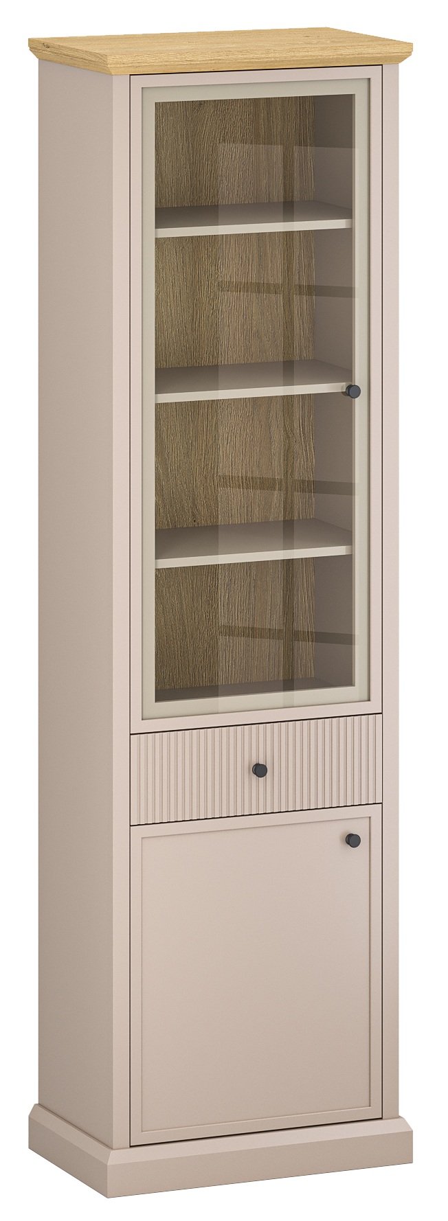Elegantna vitrina Idello 1d1w1s u boji taupe i hrasta kamenog savršen je komad namještaja za sve koji žele moderan, a istovremeno topao ambijent doma. Izrađena je u renomiranoj tvornici Black Red White u Poljskoj, što jamči kvalitetnu izvedbu i pouzdanu obradu detalja. Svojim uravnoteženim omjerom između funkcionalnosti i estetike vitrina nudi dovoljno prostora za pohranu i izlaganje omiljenih predmeta koje želite imati uvijek na vidiku.