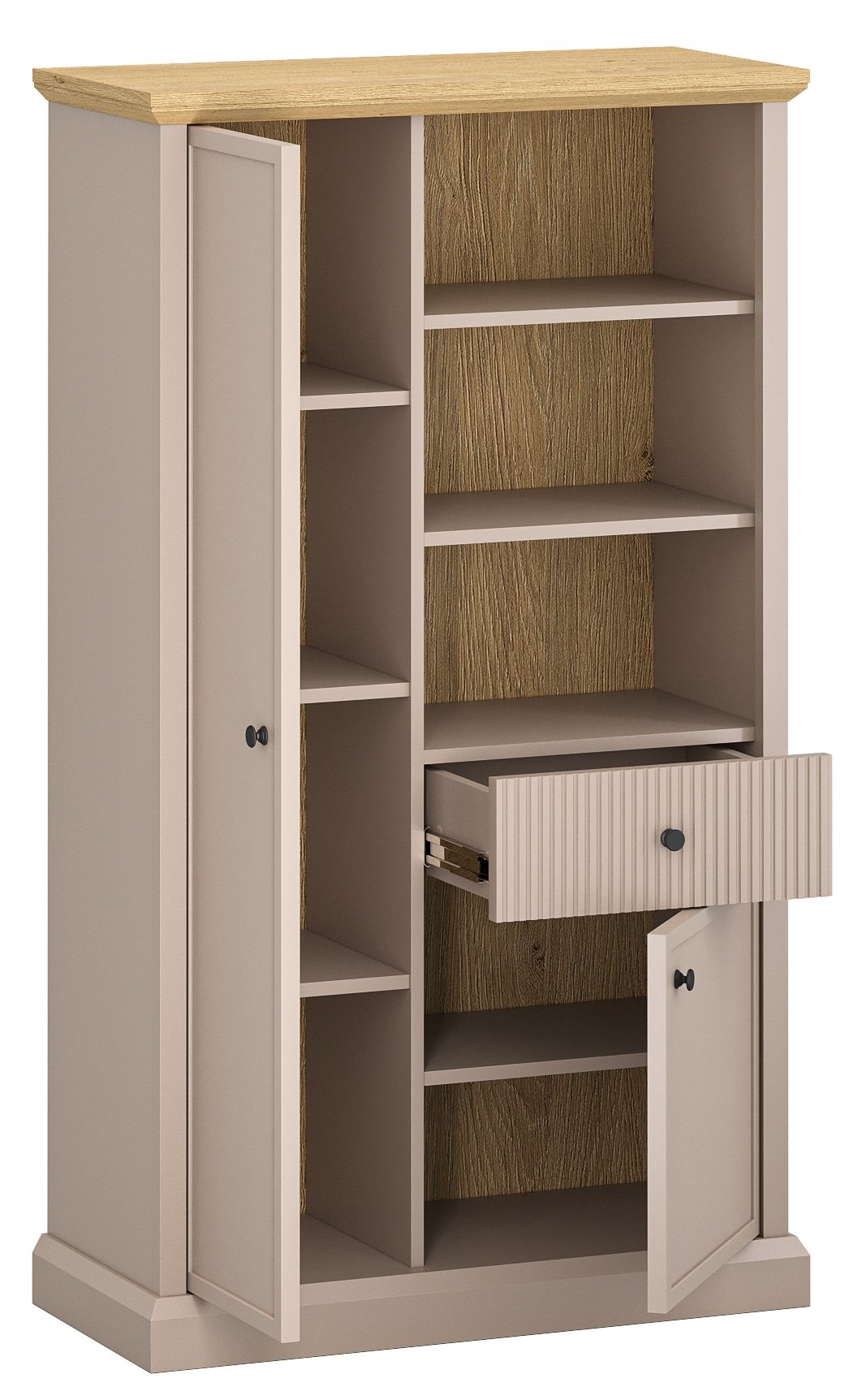 Regal Idello 2d1s zahvaljujući neutralnoj kombinaciji boja i čistim linijama savršeno se uklapa s drugim komadima namještaja iz iste serije ili s postojećom opremom doma. Površina u imitaciji drva dodaje toplinu, dok metalne ručke i staklene površine unose dašak modernosti. Takva kombinacija tekstura omogućuje da regal postane središnji element prostora, a da pritom ne djeluje nametljivo.
