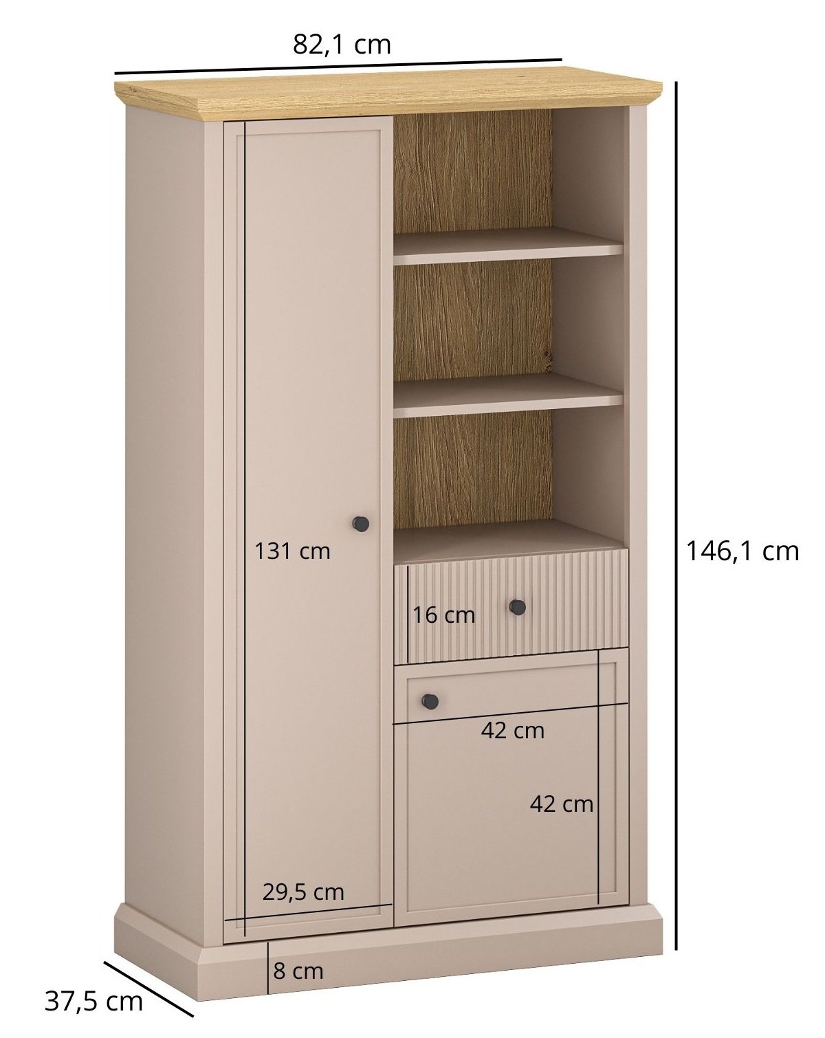 Regal Idello 2d1s u kolor kombinaciji taupe i kamenog hrasta moderan je komad namještaja koji spaja funkcionalnost, estetiku i kvalitetnu izradu. Izrađen je u poznatoj tvornici Black Red White u Poljskoj te predstavlja idealan izbor za sve koji traže elegantan i izdržljiv regal za dnevni boravak, blagovaonicu ili predsoblje. Njegove promišljene dimenzije 82x37,5x146 cm omogućuju postavljanje i u manje prostore, gdje je važno učinkovito iskorištavanje svakog centimetra.