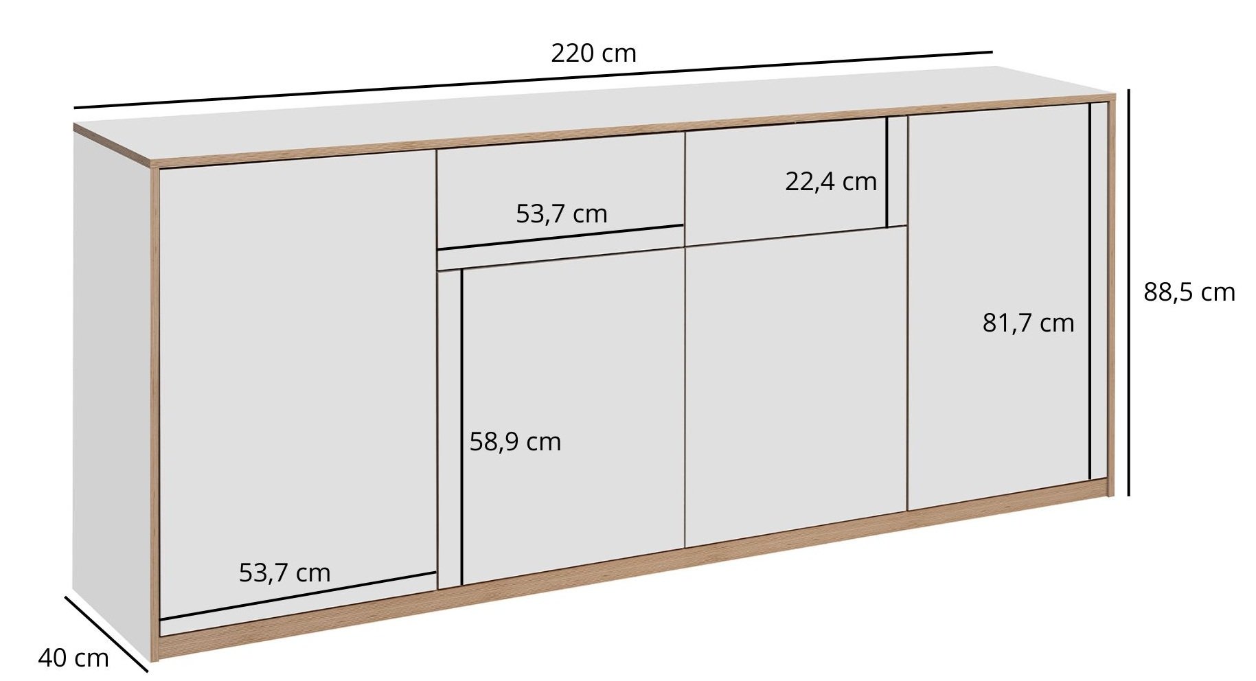 Komoda 4d2s Complex je suvremen komad namještaja koji spaja funkcionalnost, estetiku i kvalitetnu izradu. Njezine čiste linije, bijela boja te ukrasna letvica u dekoru drva stvaraju ugodan kontrast koji se izvrsno uklapa u različite suvremene interijere. Komoda je izrađena od izdržljive laminirane iverne ploče, što osigurava jednostavno održavanje i dug vijek trajanja. Dimenzije 220x40x88,5 cm omogućuju prostrano pohranjivanje, a da pritom ne zauzme previše mjesta u prostoru.