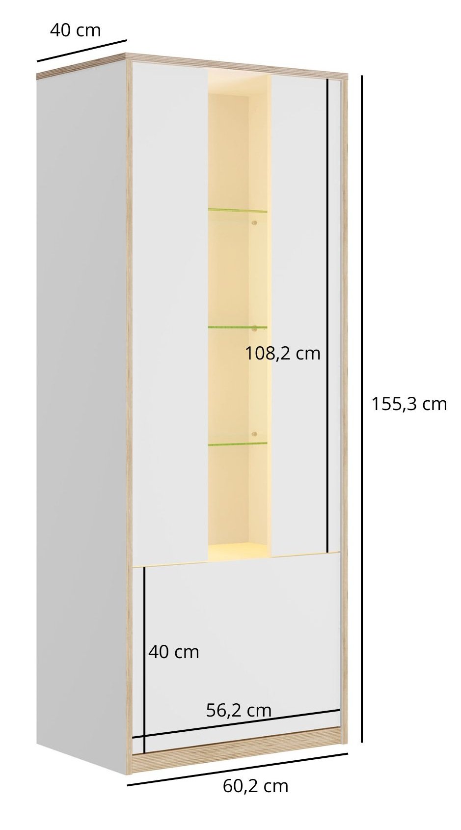 Vitrina mjeri 60 cm širine, 40 cm dubine i 155 cm visine. Takve mjere omogućuju da komad namještaja ne zauzme previše prostora, a ipak nudi dovoljno unutarnjeg kapaciteta za pohranu. Zbog uravnoteženih proporcija moguće ju je kombinirati s drugim elementima iz iste kolekcije ili s namještajem različitih stilova. Možete ju postaviti uz zid ili u kut prostorije, gdje će služiti kao estetski i praktičan dodatak interijeru.