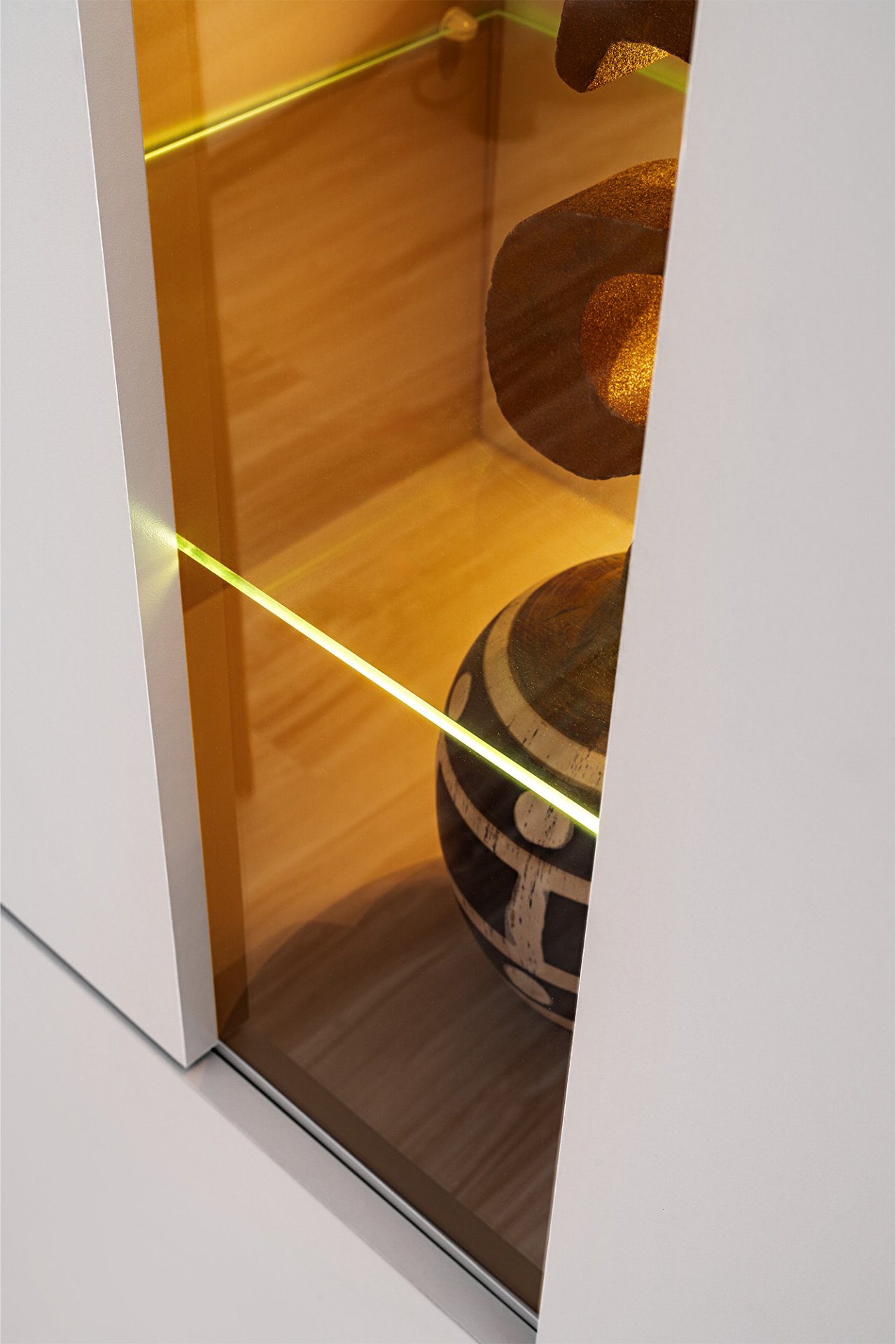 Vitrina je u bijeloj boji s dodatnom drvenom letvicom, što stvara prirodan kontrast i osjećaj topline. Bijela površina vizualno povećava prostor i dodaje svježinu, dok drveni detalj donosi dašak prirodnosti. Takva kombinacija idealna je za suvremene dnevne sobe, blagovaonice ili hodnike, gdje želite stvoriti svijetao i prozračan ambijent.