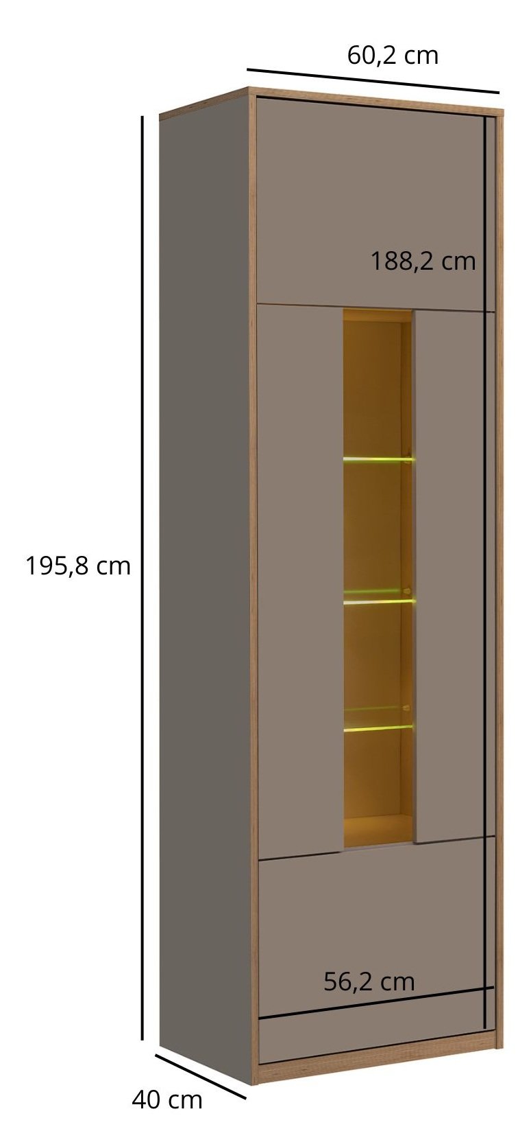 Elegantna vitrina Complex 1w u boji siva kamena s nježnim drvenim dekorom spaja moderan izgled i praktičnost. S dimenzijama 60x40x196 cm idealan je izbor za dnevne sobe, blagovaonice ili hodnike, gdje želite dodati dašak urednosti i svjetlosti. Izrađena je s mišlju na trajnost i kvalitetu, stoga njezina površina ostaje otporna na svakodnevnu upotrebu i jednostavna za čišćenje. Ugrađeno LED osvjetljenje s niskom potrošnjom energije stvara ugodnu atmosferu i naglašava izložene predmete unutar vitrine.