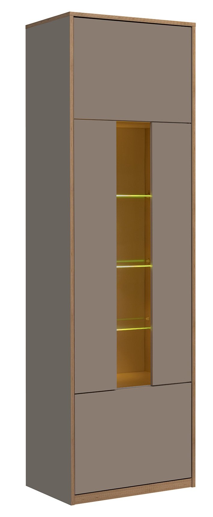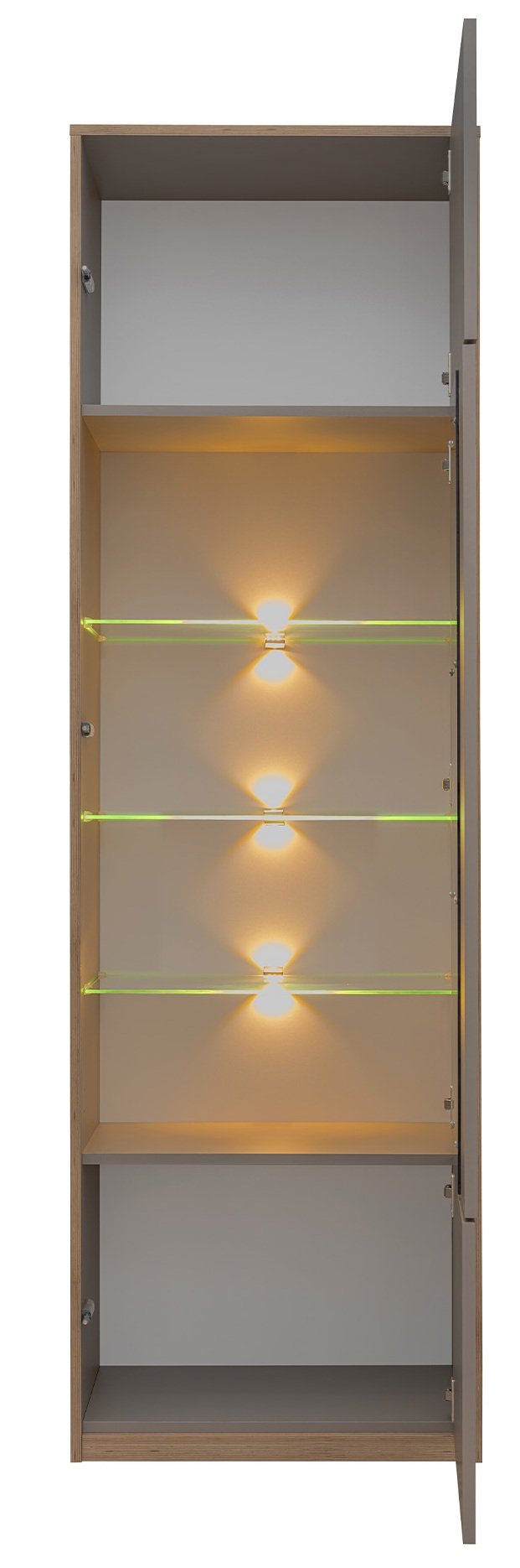 Vitrina Complex 1w dizajnirana je tako da omogućuje jednostavno kombiniranje s drugim elementima iz iste kolekcije ili s namještajem različitih stilova. Njezin profinjen izgled u sivoj kamenoj boji s drvenim dodirom lijepo se slaže sa svijetlim ili tamnim interijerima. LED osvjetljenje u unutrašnjosti naglašava dekorativne predmete, knjige ili stakleno posuđe, a istodobno stvara meko ambijentalno svjetlo u prostoru. Zbog kompaktne širine od 60 cm vitrina ne zauzima mnogo prostora, ali ipak nudi dovoljno mjesta za pohranu i izlaganje.