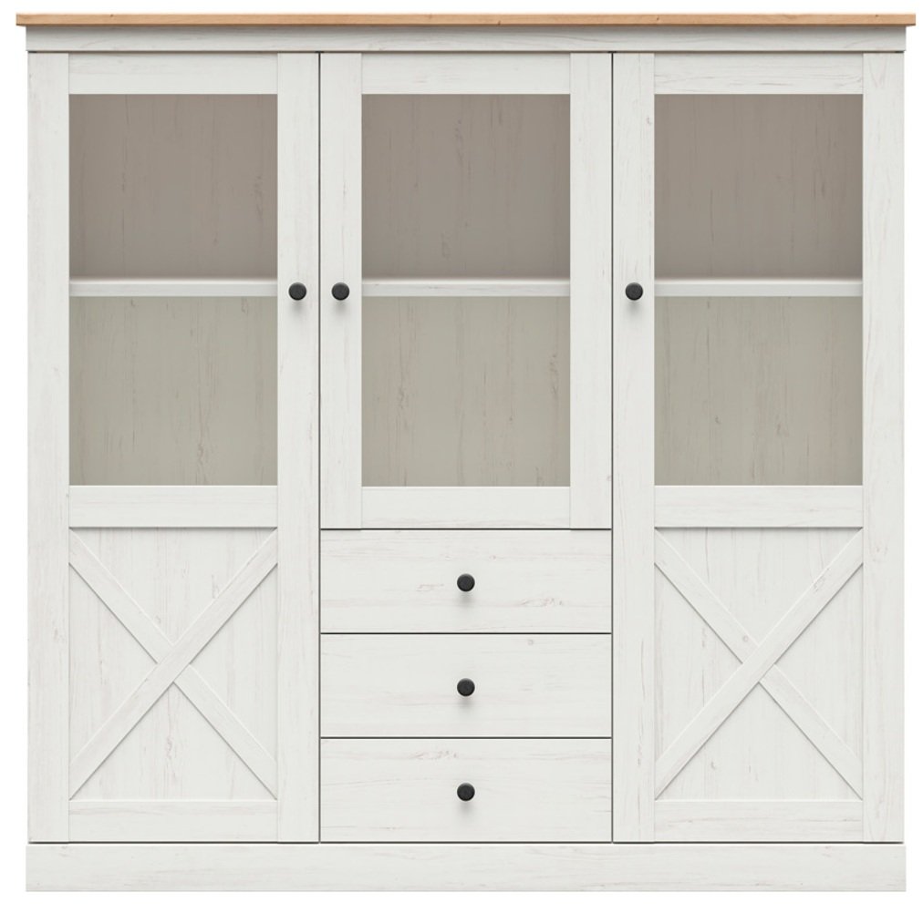 Izgled vitrine Frija obilježavaju jednostavne linije i harmonična kombinacija dviju boja – svijetlog bijelog andersenovog bora i toplog artisan hrasta. Donje fronte krase križne letvice koje dodaju diskretan rustikalni dojam, dok elegantne okrugle ručke omogućuju udobno otvaranje vrata i ladica. Takav dizajn lako se prilagođava različitim stilovima uređenja – od klasičnog do modernog skandinavskog.