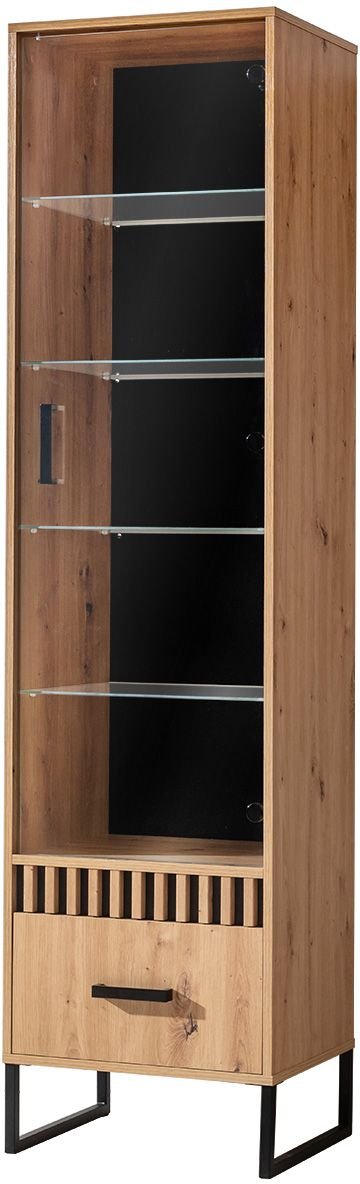 Vitrina je dizajnirana u nijansi hrast artisan, koja se odlično slaže s prirodnim materijalima i svijetlim tonovima interijera. Površina laminirane ploče imitira teksturu drva, što namještaju daje autentičnost i dojam ručne izrade. Jednostavne linije i čisti oblik omogućuju da se vitrina lako uklopi u različite stilove uređenja – od rustikalnog do minimalističkog. Takva vizualna prilagodljivost karakteristika je koju cijene korisnici koji žele zadržati sklad interijera i toplinu domaćeg ambijenta.