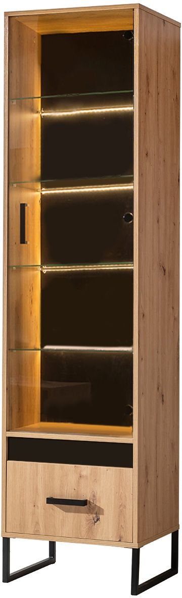 Elegantna vitrina Lamelix 03 robne marke Domel u bezvremenskom dekoru artisan hrast donosi prirodan izgled drva i praktičan dizajn u svaki dom. Svojim dimenzijama 50×40×195,7 cm savršeno se uklapa i u manje i u veće prostore, jer nudi dovoljno mjesta za pohranu i izlaganje osobnih predmeta, posuđa ili dekoracija. Vitrina je izrađena od iverne laminirane ploče debljine 16 mm, što osigurava čvrstoću, stabilnost i jednostavno održavanje površine.
