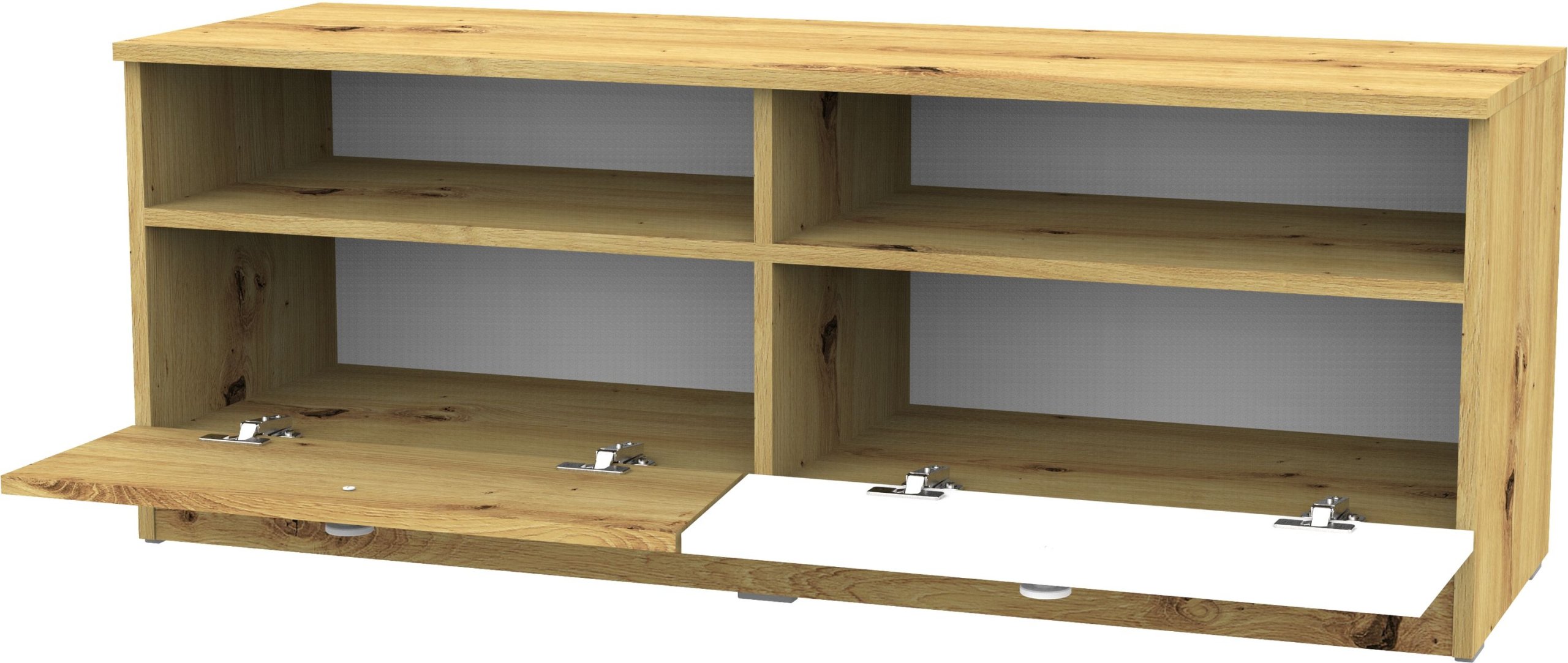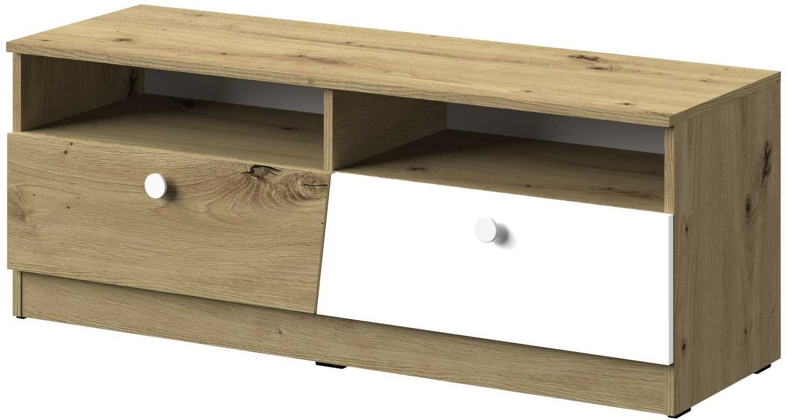 TV komoda Nero 08 Domel donosi uravnoteženu kombinaciju prirodnog izgleda artisan hrasta i elegantnih mat površina, koje stvaraju ugodan kontrast u suvremenim dnevnim prostorima. Svojim kompaktnim dimenzijama 120×40×45 cm savršeno se uklapa u manje i srednje velike dnevne sobe, gdje nudi funkcionalnu površinu za televizor te dovoljno prostora za pohranu elektroničkih uređaja, multimedijskih dodataka i dekorativnih predmeta. Laminirana iverica debljine 16 mm osigurava dobru stabilnost i jednostavno održavanje, a pritom zadržava ugodan dodir i prirodan izgled drveta.