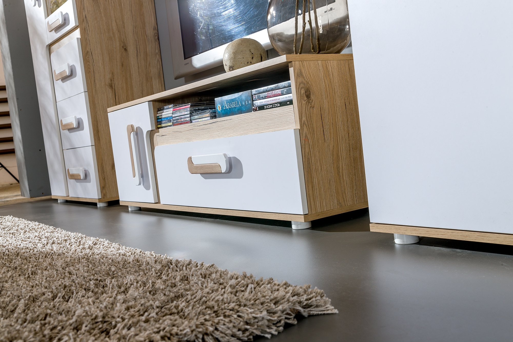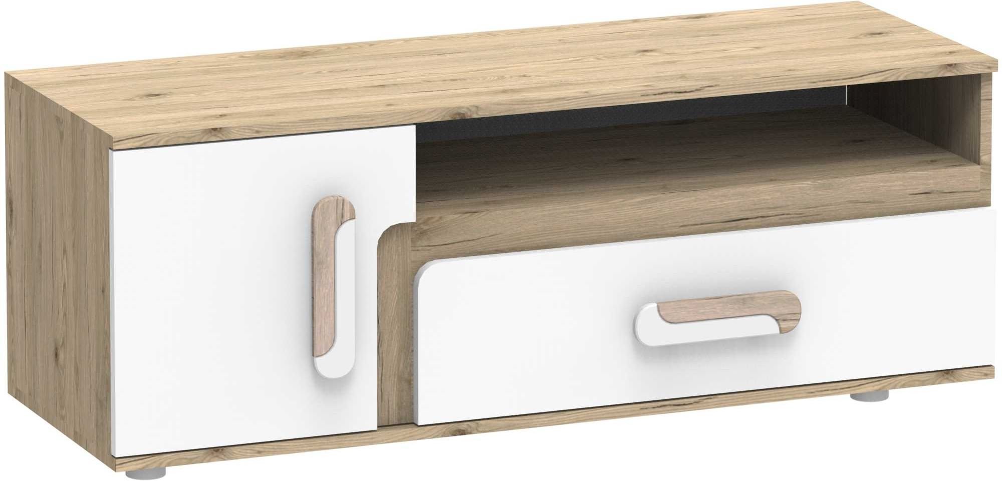 Dimenzije komode iznose 120×40×42 cm, što omogućuje optimalan raspored prostora ispod televizora. Na gornju površinu možete postaviti televizor, dekorativne elemente ili elektroničke uređaje, dok unutarnje ladice i police omogućuju pohranu multimedijskih uređaja, daljinskih upravljača, kabela ili drugih dodataka. Ladice su opremljene pouzdanim kugličnim vodilicama, koje omogućuju glatko i tiho otvaranje i zatvaranje. Ručke su izrađene od sintetičkog materijala u kombinaciji bijele i svijetlohrastove boje, što upotpunjuje cjelokupan izgled komode i olakšava svakodnevnu upotrebu.