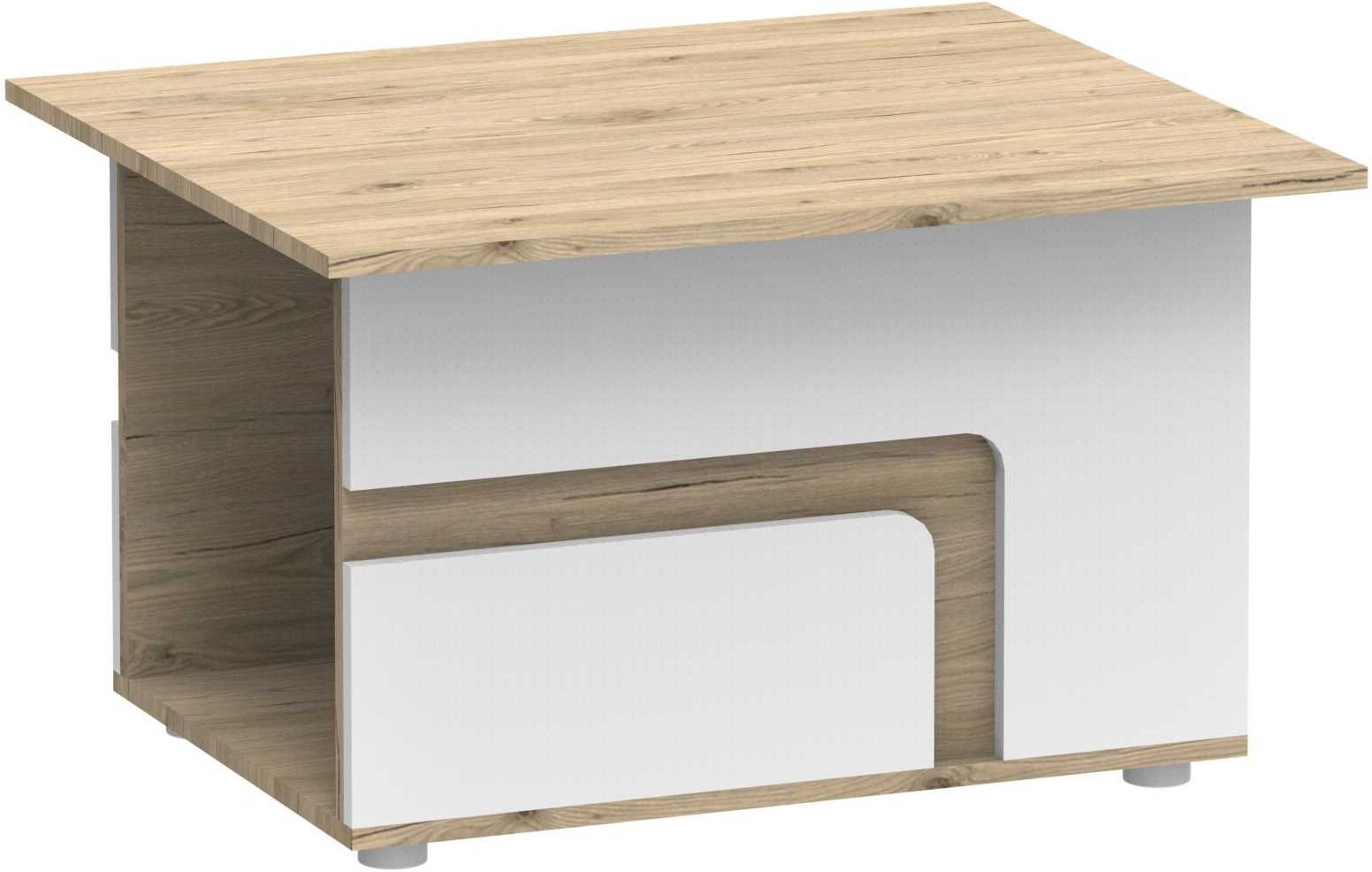 Klupski stolić Apetito 18 u boji svijetlog hrasta elegantno je i funkcionalno rješenje za moderan dnevni prostor. Njegova kombinacija svijetlog hrasta i bijelih fronti stvara ugodan kontrast koji se harmonično uklapa s različitim stilovima namještaja. S dimenzijama 80 × 68 × 45,2 cm nudi dovoljno površine za odlaganje, a istovremeno ne zauzima previše prostora u manjem dnevnom boravku. Izrađen je u tvornici Domel u Poljskoj, što jamči preciznu izradu i pouzdanu kvalitetu.