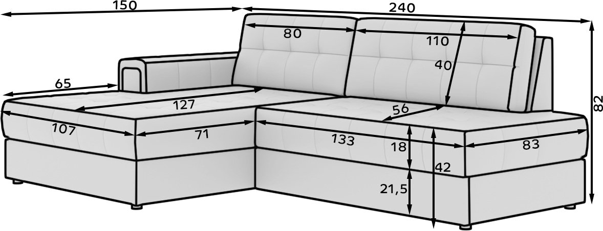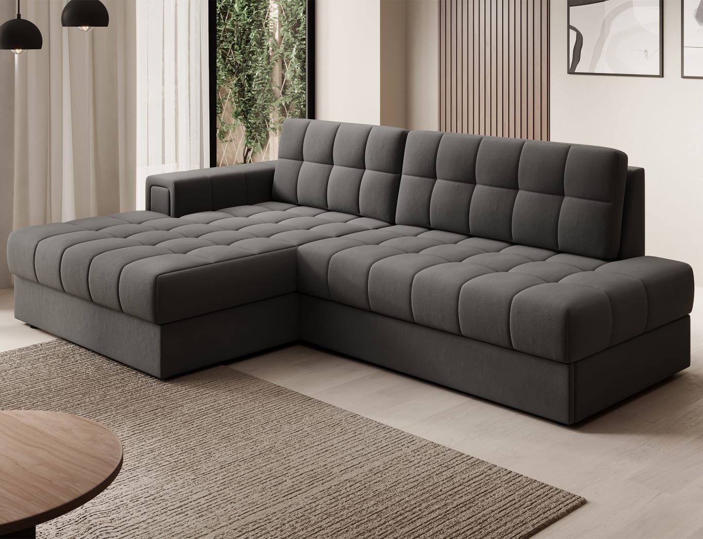Ako tražite savršenu kombinaciju suvremenog dizajna, praktične funkcionalnosti i dugotrajne udobnosti, ova kutna garnitura odličan je izbor za vaš dom. S dimenzijama 240x150x82 cm nudi dovoljno prostora za opuštene trenutke u društvu, gledanje televizije ili kratki popodnevni odmor. Istodobno, jednostavnim Delfin mehanizmom možete je u nekoliko poteza pretvoriti u udoban ležaj dimenzija 124x215 cm. Tako je idealno rješenje za manja stanovanja, gdje je važno da je svaki komad namještaja funkcionalan i prilagodljiv.