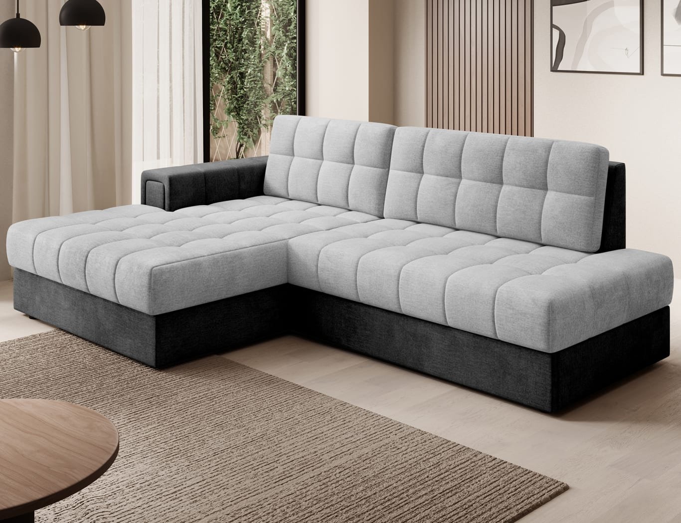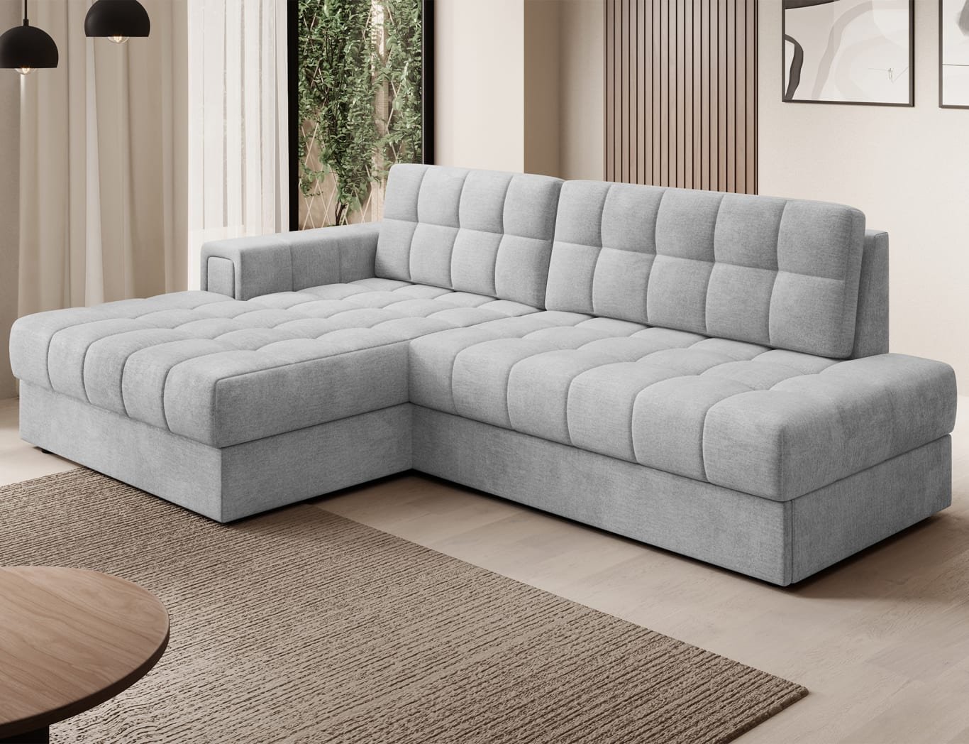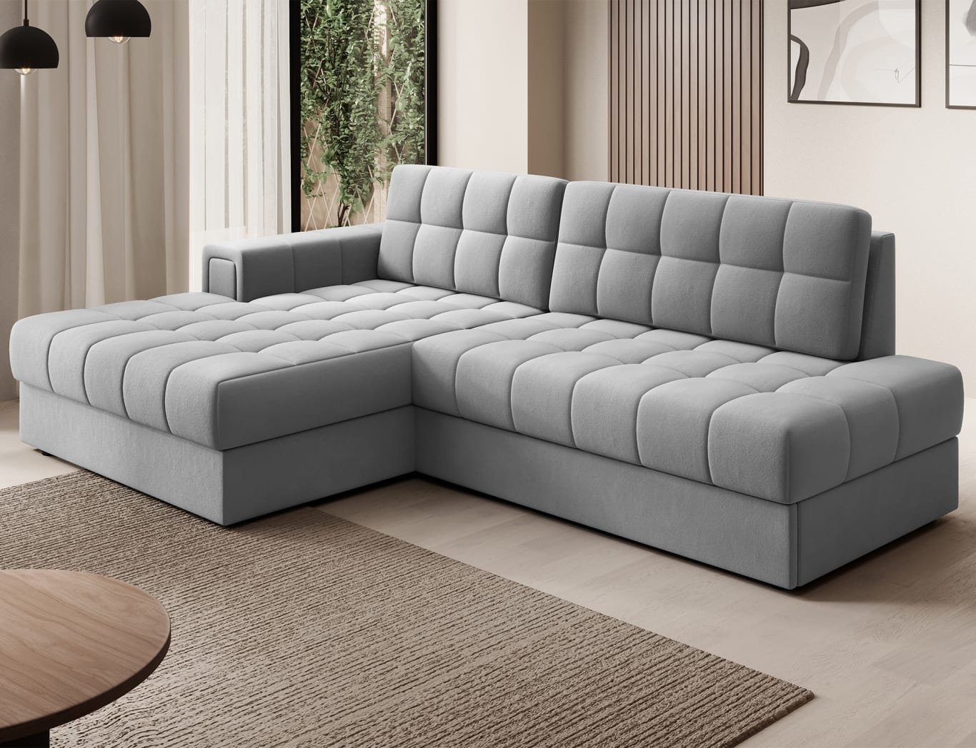 Kutna garnitura Blezalt savršeno je spoj suvremenog dizajna, funkcionalnosti i udobnosti. Njezine dimenzije 240x150x82 cm osiguravaju prostor za svakodnevni odmor, funkcija ležaja i ladica za posteljinu čine je idealnim izborom za svaki ambijent. Sjedište od poliuretanske pjene T2540 i valovite opruge tipa B osigurava udobnost i otpornost na deformacije, a punjenje od pjene u naslonu prilagođava se tijelu te pruža optimalnu potporu. Zahvaljujući mehanizmu razvlačenja Delfin, kutna garnitura se u nekoliko sekundi pretvara u udoban ležaj, a ladica za posteljinu omogućuje pohranu dodatnog tekstila. Tapecirani stražnji dio osigurava elegantan izgled sa svih strana, dok crne plastične nogice dodaju stabilnost i lakoću. Idealna za dnevni boravak, stambeni prostor i moderne interijere, nudi udobnost i stil dugi niz godina.
