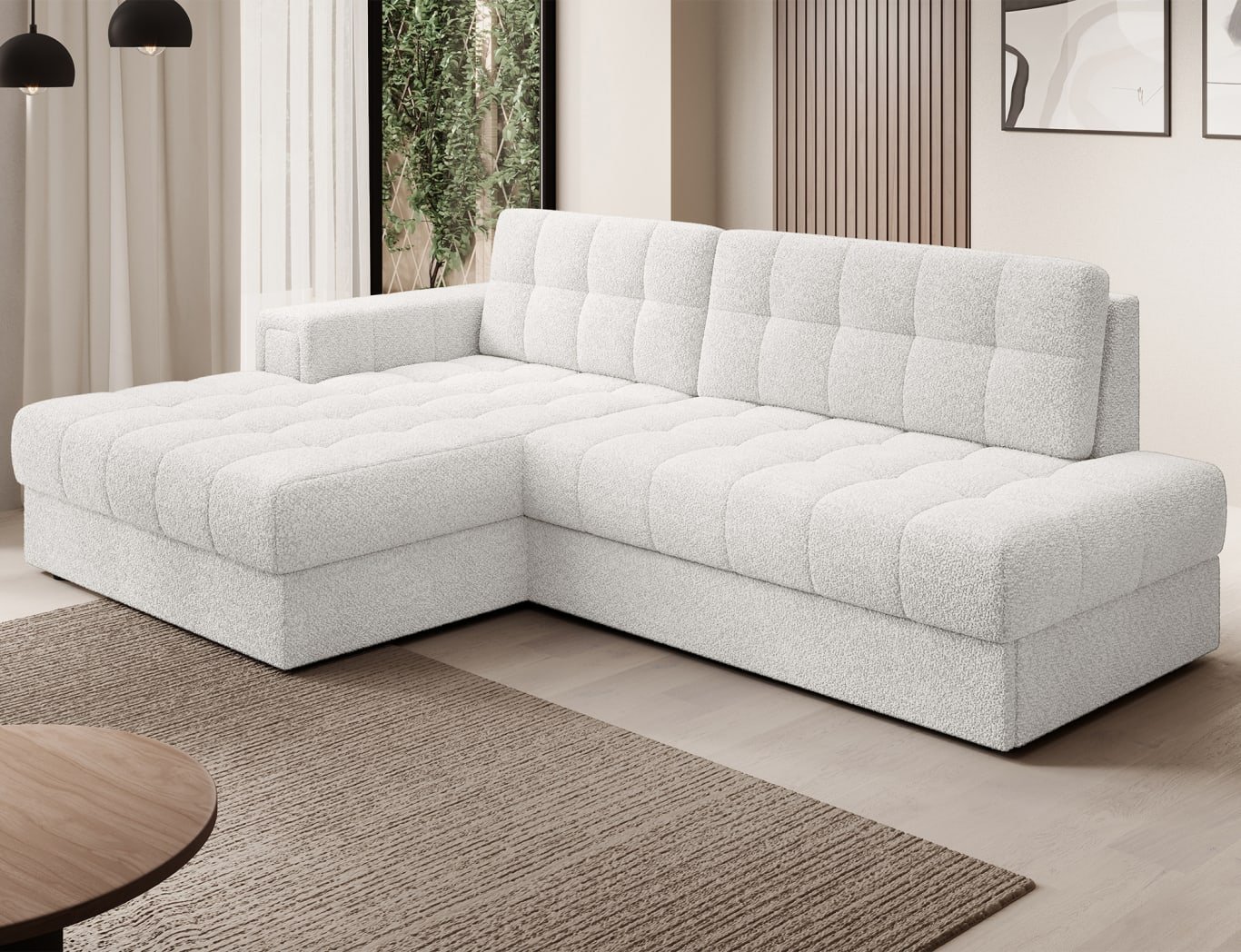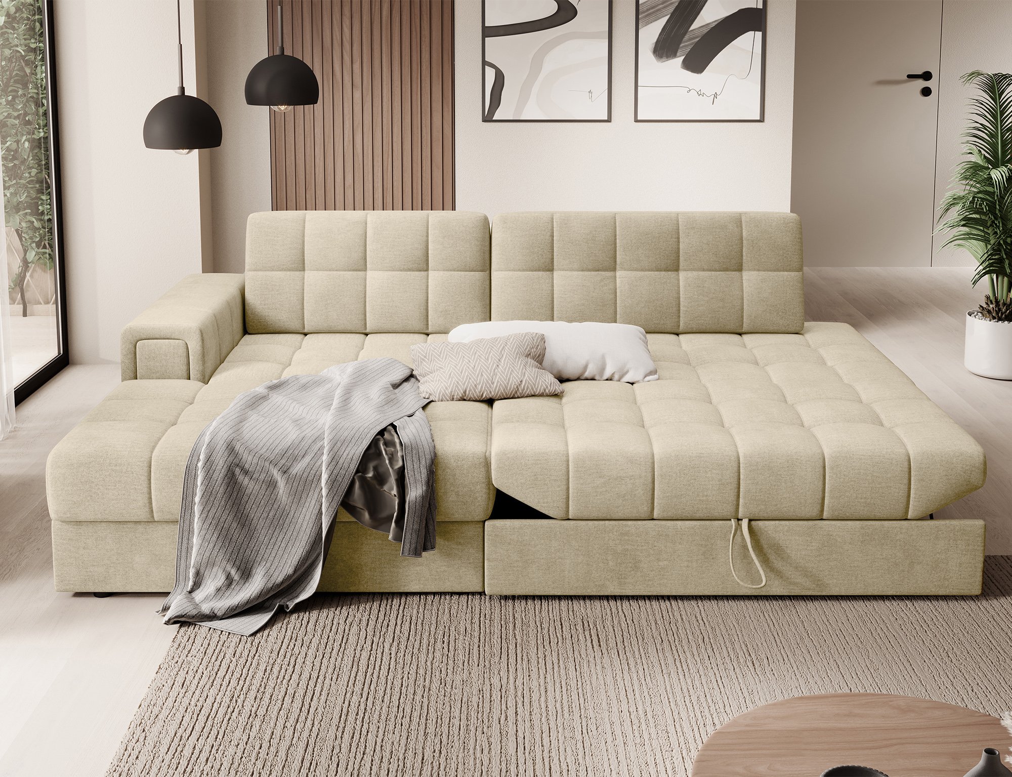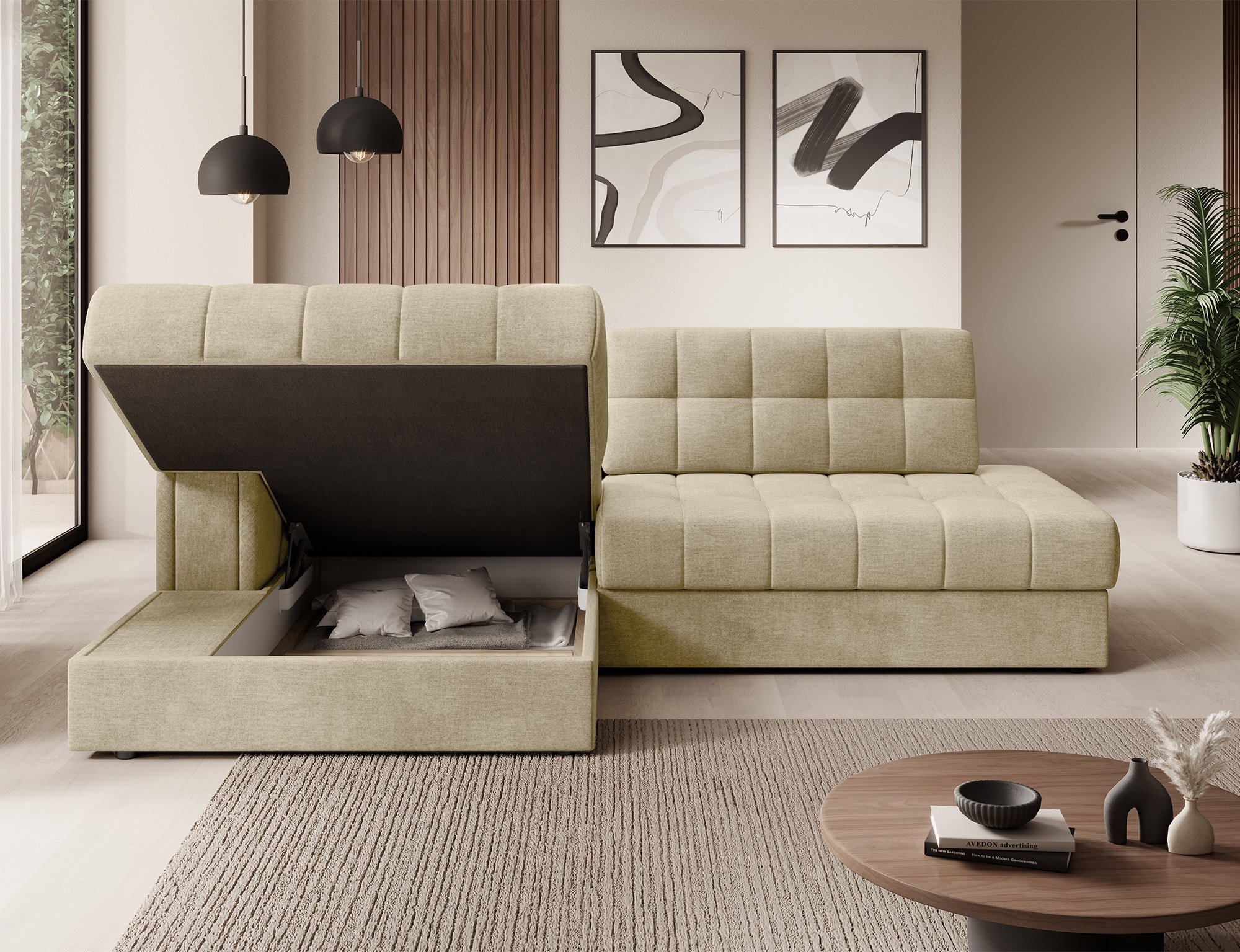 Kutna garnitura Blezalt savršeno je spoj suvremenog dizajna, funkcionalnosti i udobnosti. Njezine dimenzije 240x150x82 cm osiguravaju prostor za svakodnevni odmor, funkcija ležaja i ladica za posteljinu čine je idealnim izborom za svaki ambijent. Sjedište od poliuretanske pjene T2540 i valovite opruge tipa B osigurava udobnost i otpornost na deformacije, a punjenje od pjene u naslonu prilagođava se tijelu te pruža optimalnu potporu. Zahvaljujući mehanizmu razvlačenja Delfin, kutna garnitura se u nekoliko sekundi pretvara u udoban ležaj, a ladica za posteljinu omogućuje pohranu dodatnog tekstila. Tapecirani stražnji dio osigurava elegantan izgled sa svih strana, dok crne plastične nogice dodaju stabilnost i lakoću. Idealna za dnevni boravak, stambeni prostor i moderne interijere, nudi udobnost i stil dugi niz godina.