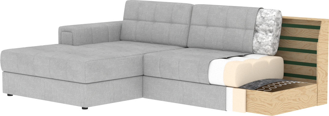 Sjedište je izrađeno od kvalitetne poliuretanske pjene T2540 i valovitih opruga tipa B, što osigurava visoku razinu udobnosti i otpornost na slijeganje. To znači da će garnitura i nakon više godina upotrebe zadržati svoj oblik i potporu. Naslon, punjen pjenom, potpuno se prilagođava tijelu i pruža ugodan osjećaj pri sjedenju ili ležanju. Stabilan drveni okvir osigurava izdržljivost i dug životni vijek, dok crne dekorativne nogice dodaju dašak elegancije i vizualne lakoće.