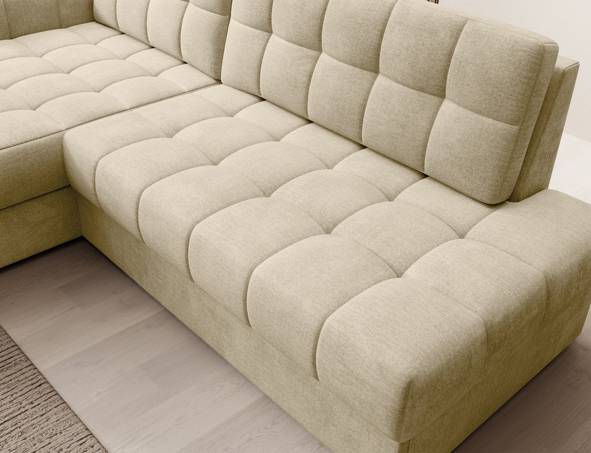 Jedna od najvećih prednosti ove garniture je njezina višenamjenskost. Ugrađena ladica za posteljinu omogućuje praktično spremanje deka, jastuka ili posteljine, što je posebno korisno u manjim stanovima gdje je prostor dragocjen. Funkcija razvlačnog ležaja nudi brzo rješenje kada vam je potrebna dodatna površina za spavanje za goste. Osim toga, dostupna je u različitim bojama i tkaninama, što omogućuje da je potpuno prilagodite svom unutarnjem stilu.