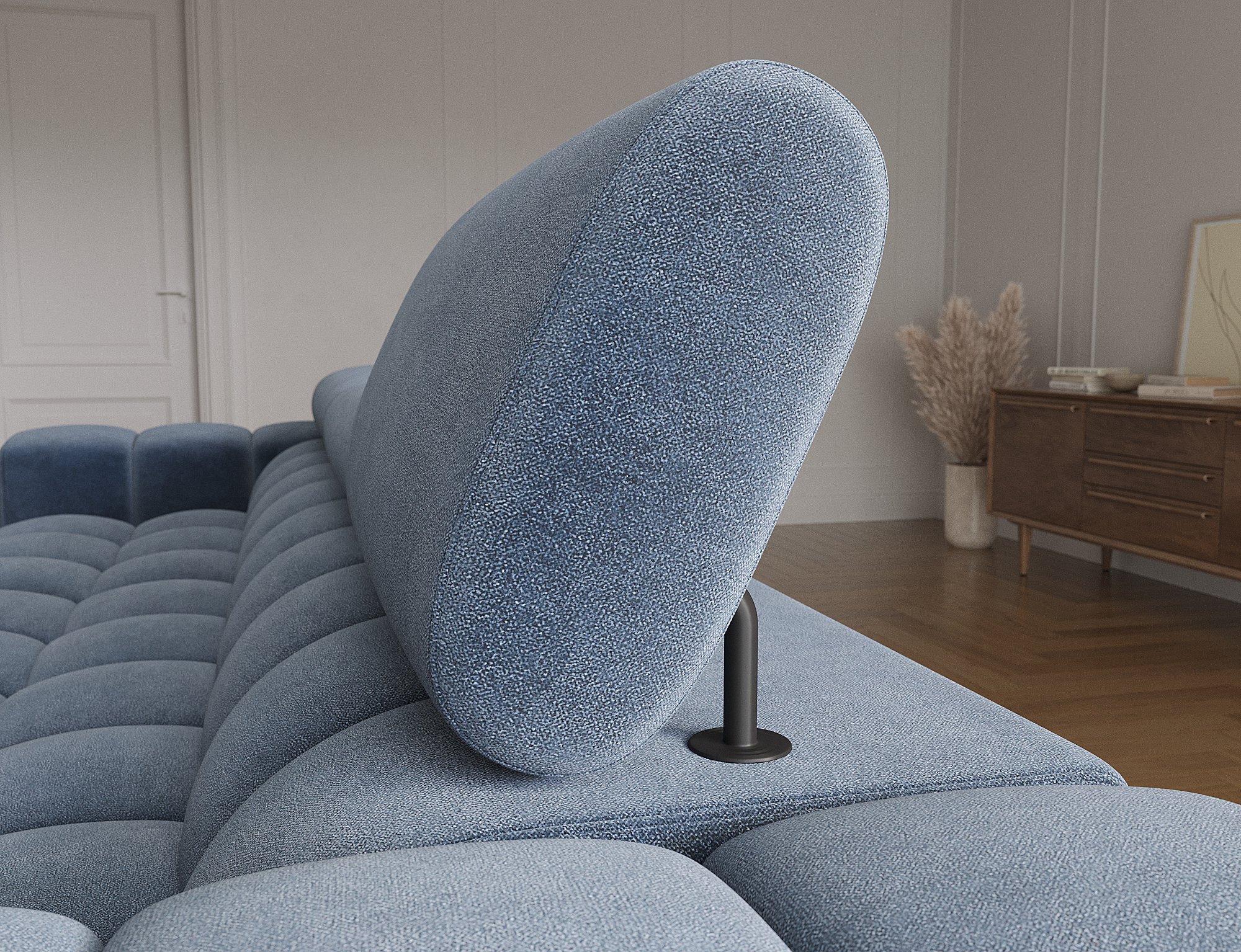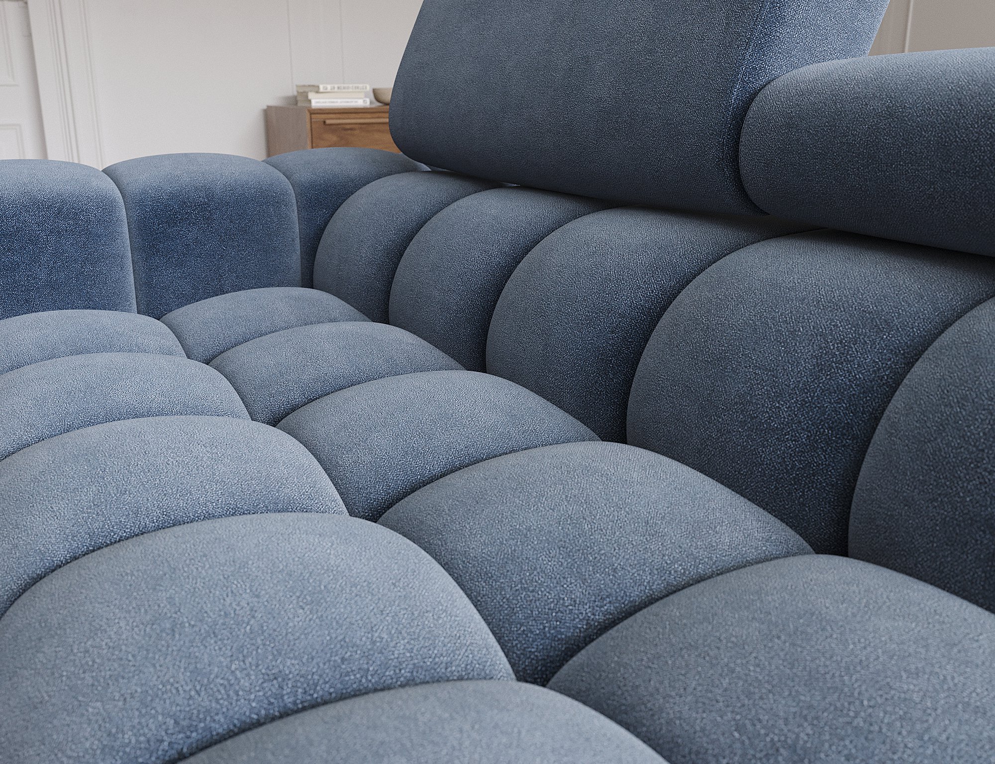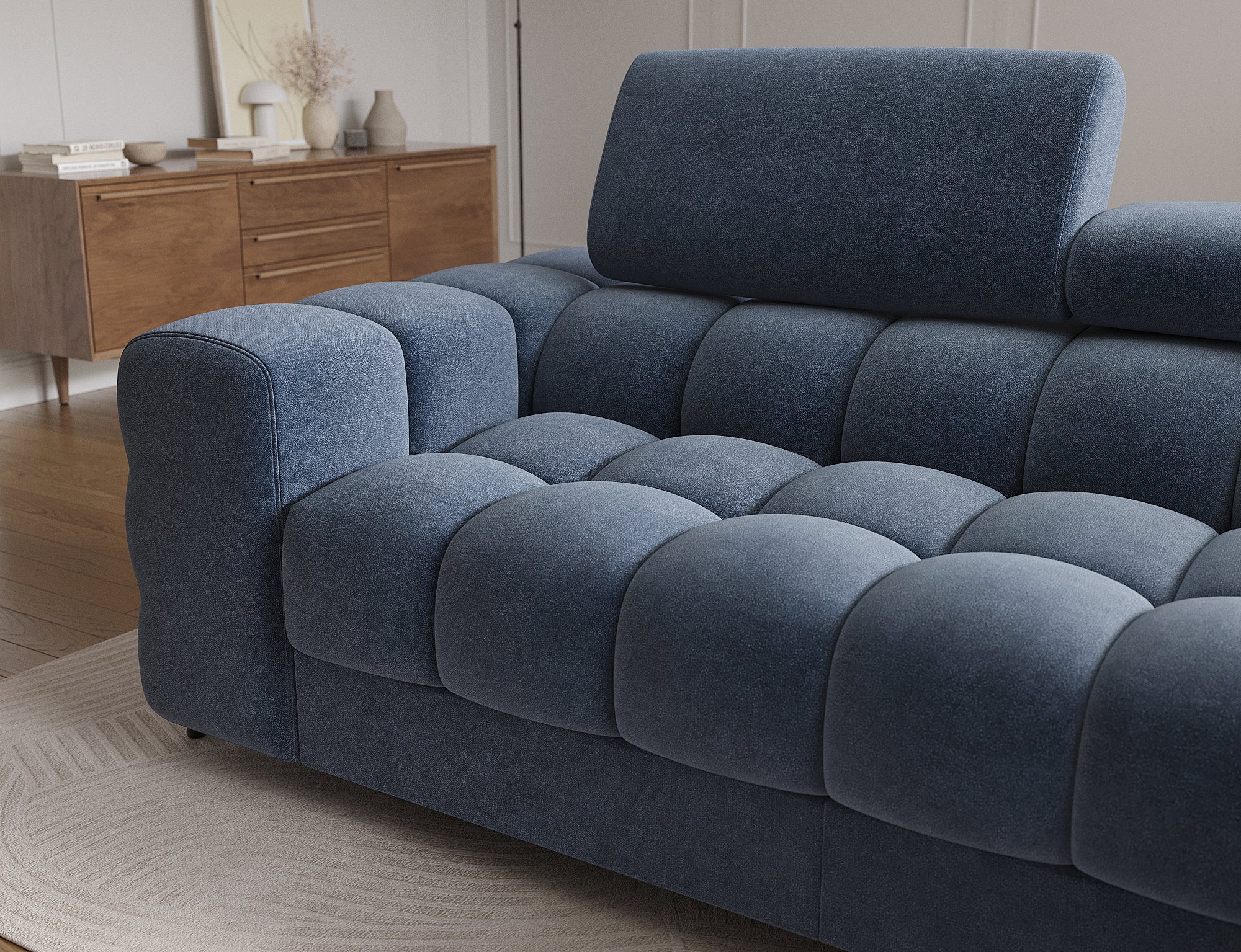 Dostupna je u različitim nijansama boja, što omogućuje da je potpuno prilagodite svom interijeru. Tkanina Aura 40, prikazana na fotografiji, naglašava moderan karakter garniture i istovremeno je ugodna na dodir te jednostavna za održavanje.