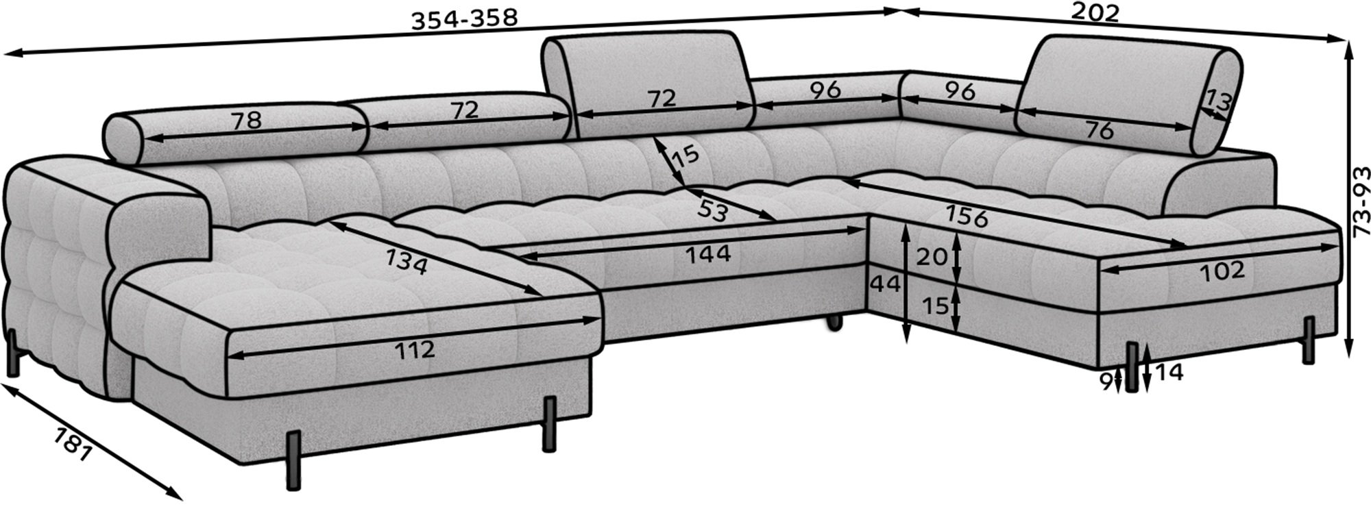 Ako želite stvoriti dnevni boravak koji spaja vrhunsku udobnost, moderan dizajn i praktičnu funkcionalnost, ova garnitura za sjedenje savršen je izbor za vaš dom. Svojim prostranim U oblikom i impresivnim dimenzijama 358x202x93 cm osigurava dovoljno prostora za opuštanje, druženje s prijateljima ili ugodne obiteljske večeri. Njezin dizajn omogućuje da se bez poteškoća prilagodi većim prostorima, gdje postaje središnji element unutarnjeg uređenja.